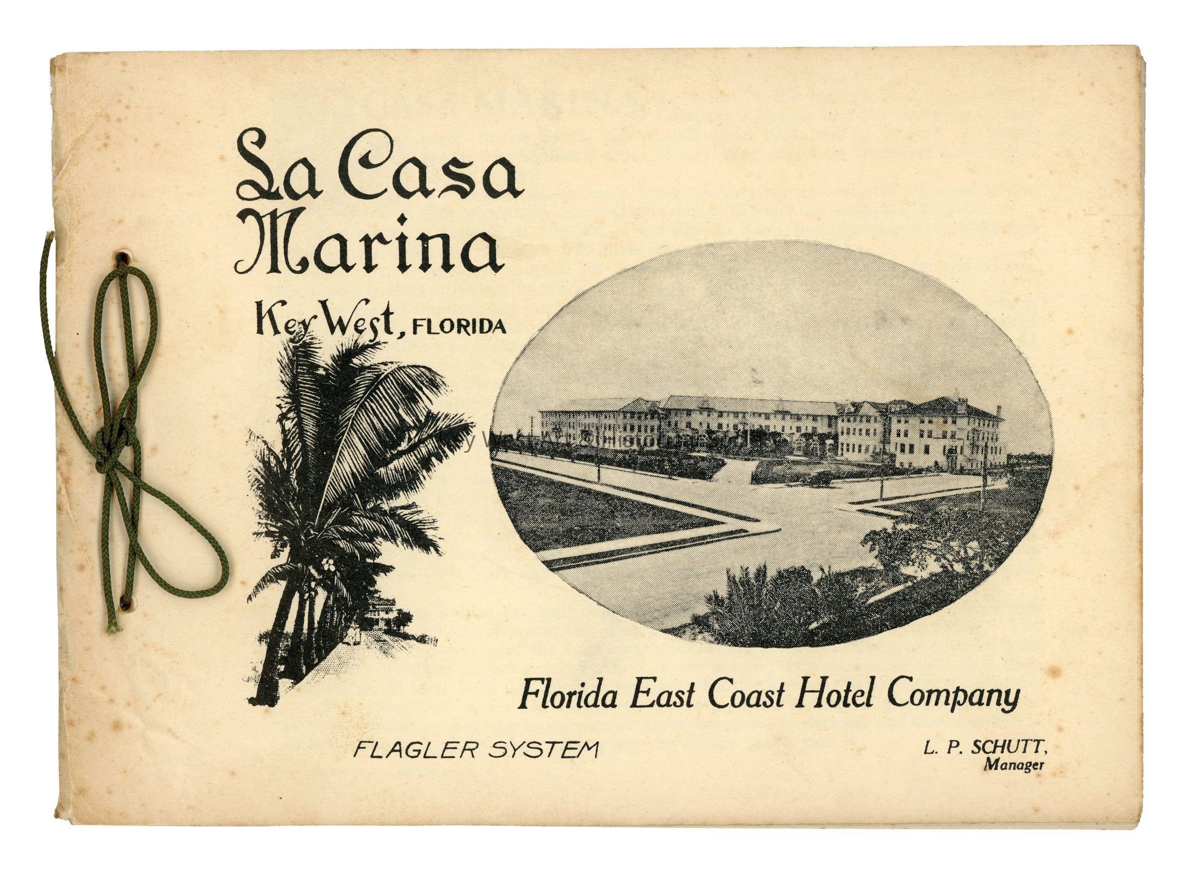 A booklet detailing information on the Casa Marina hotel which opened in 1921 as part of the Florida East Coast Hotel Company. At the time, L.P. Schutt managed the hotel. The booklet contains black and white photographs of the hotel and sites visitors can see in Key West. The booklet is bound with green string that has been tied in a bow.Collection