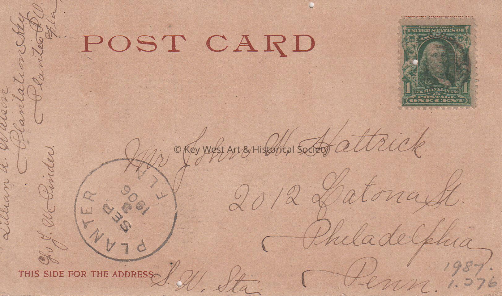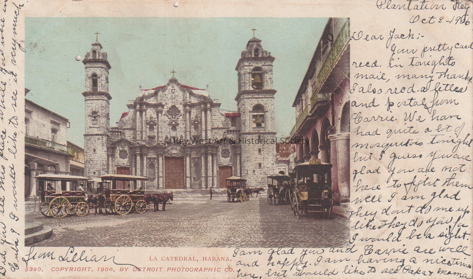 Postcard depicting a large church. The caption reads, ‘La Catedral Habana.’ The message on the front reads, ‘Plantation Key, October 2, 1906, Dear Jack: Your pretty card received in tonight's mail, many thanks. I also received a letter and postal from Carrie. We have had quite a lot of mosquitoes tonight, but I guess you are glad you are not here to fight with them. Well I am glad they don't do me up like they do you for I would be a sight I am glad you and Carrie are well and happy. I am having a nice time here, but would like to see Papa and Mama. Did you see this place while you were in Cuba? I would like to see it very much. From Lillian'. The message on the verso reads, 'Lillian A. Watson, Plantation Key, Planter P.O., Florida, care of J.M. Pinder'. The card is addressed to Mr. John W. Hattrick, 2012 Latona Street, Philadelphia, Pennsylvania, Southwest Station, and is postmarked Planter, Florida, September 3, 1906.Collection