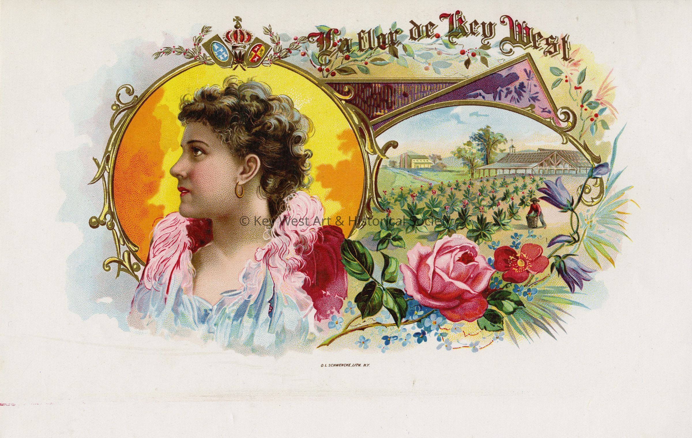 Full color lithograph inner box cigar label promoting La Flor de Key West. Likely taken from a sample book produced by the lithographer.Type of Print