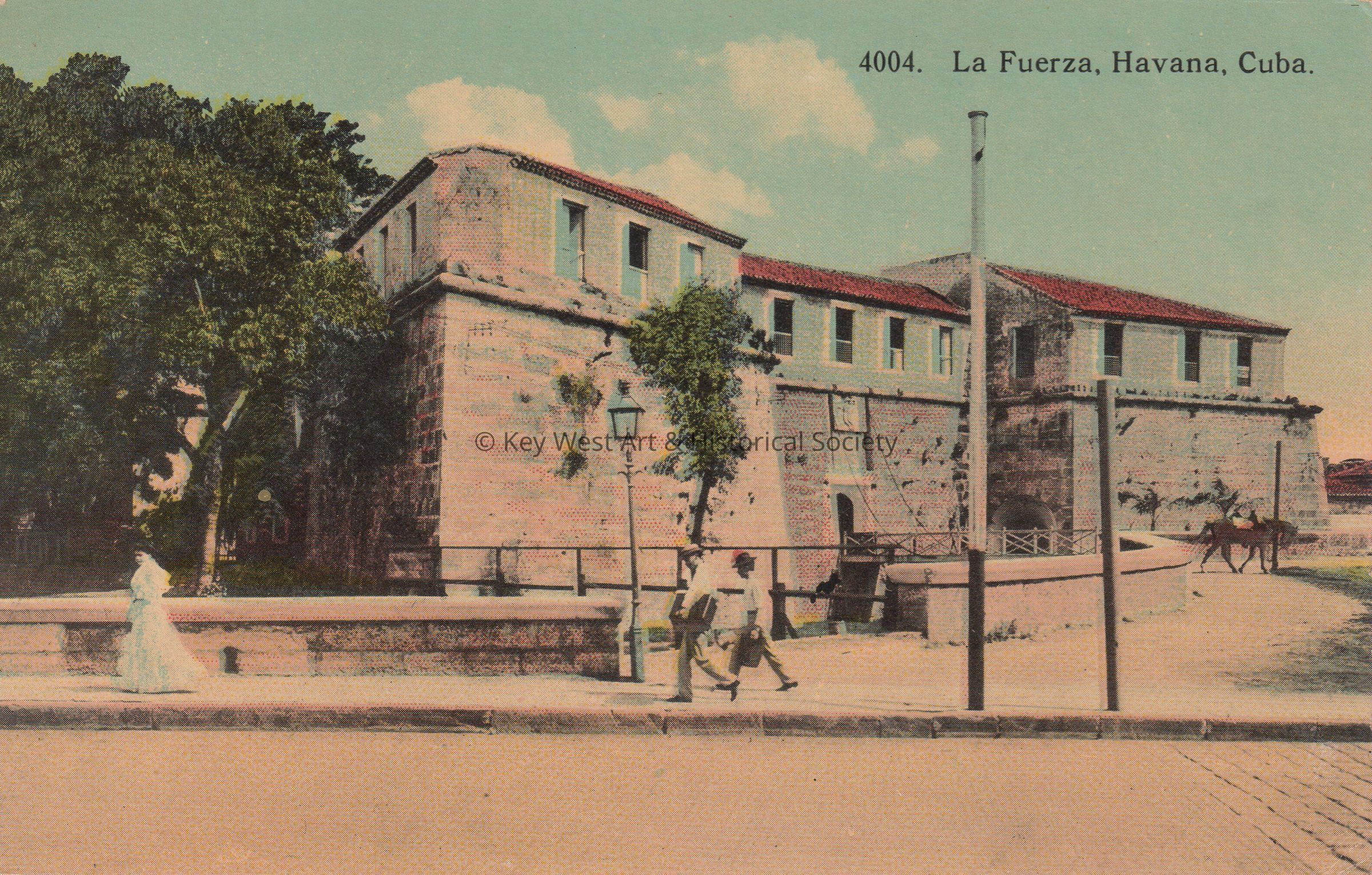 Postcard depicting people walking in front of an old fort. The caption reads, ‘La Fuerza, Havana, Cuba’. The description on the verso indicates the fort was built in 1544 and is the second oldest fortress in the world.Subject Place