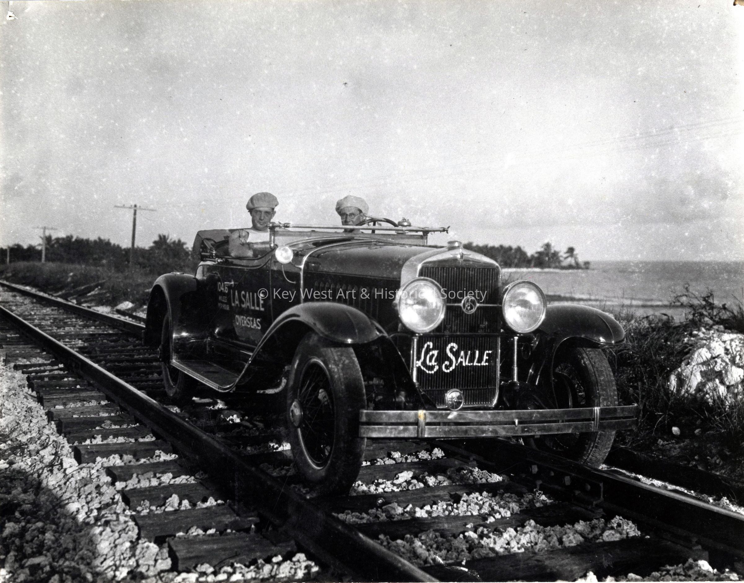 Black and white photograph of a La Salle automobile on Florida East Coast Railway train tracks on Long Key bridge. This was a promotional stunt to showcase the new 1927 La Salle motorcar. Claude Nolan, a Jacksonville Cadillac dealer, drove from Miami to Key West over the train tracks.Photograph Details