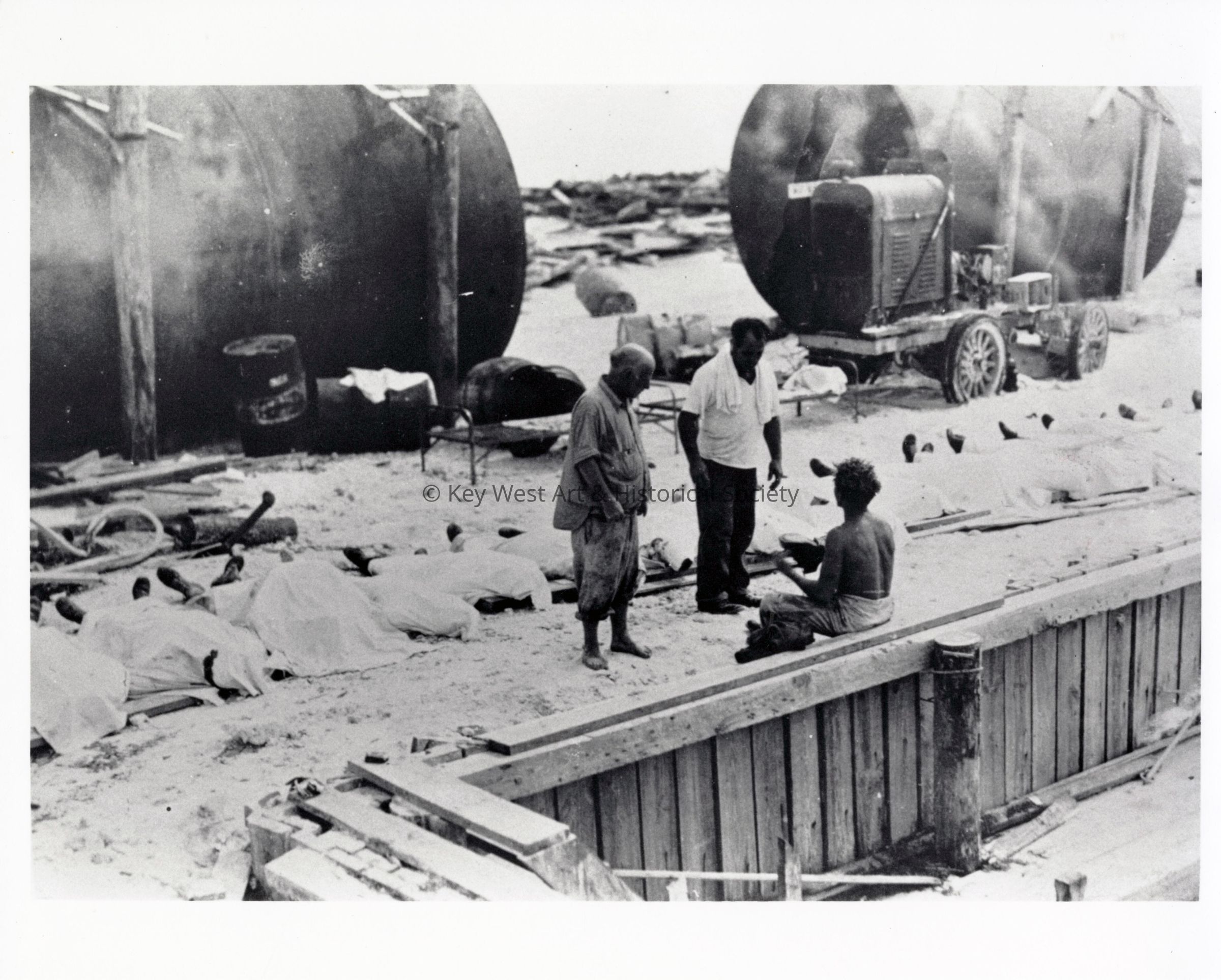 Black and white photograph of destruction caused by the Labor Day Hurricane and the recovery of bodies.