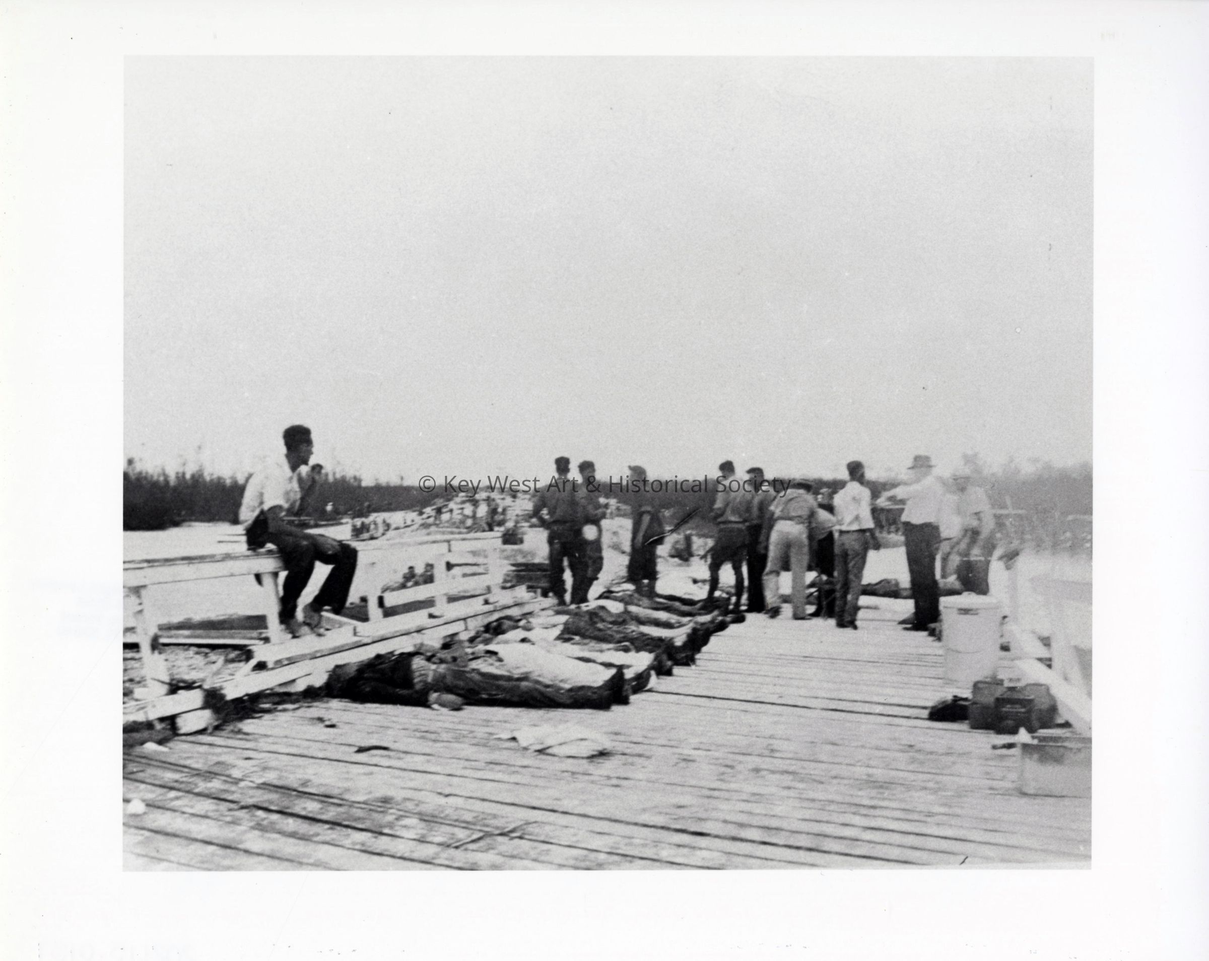 Black and white photograph of destruction caused by the Labor Day Hurricane and the recovery of bodies.