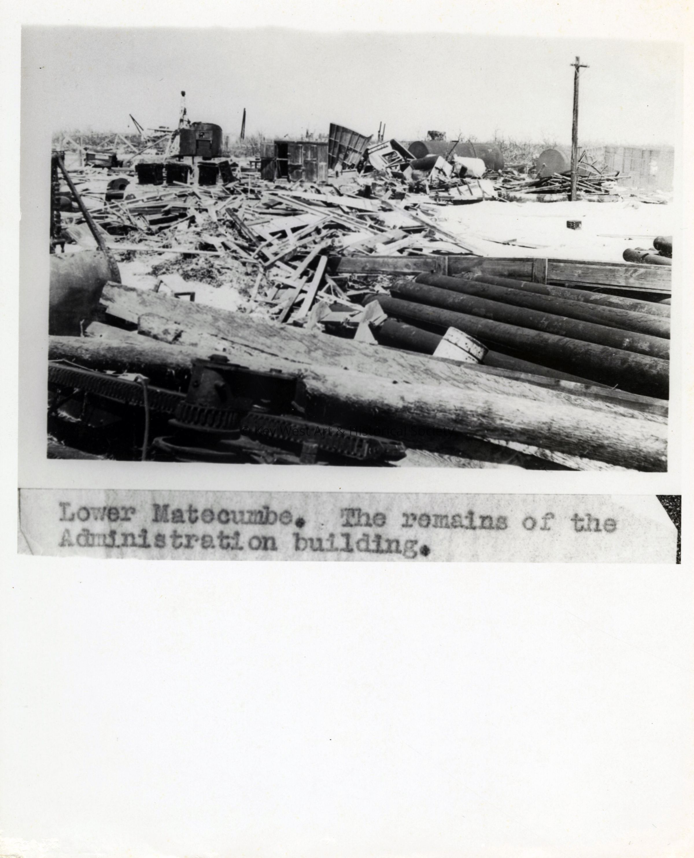 Black and white photograph of destruction of the Florida East Coast Railway administration building on Lower Matecumbe caused by the Labor Day Hurricane