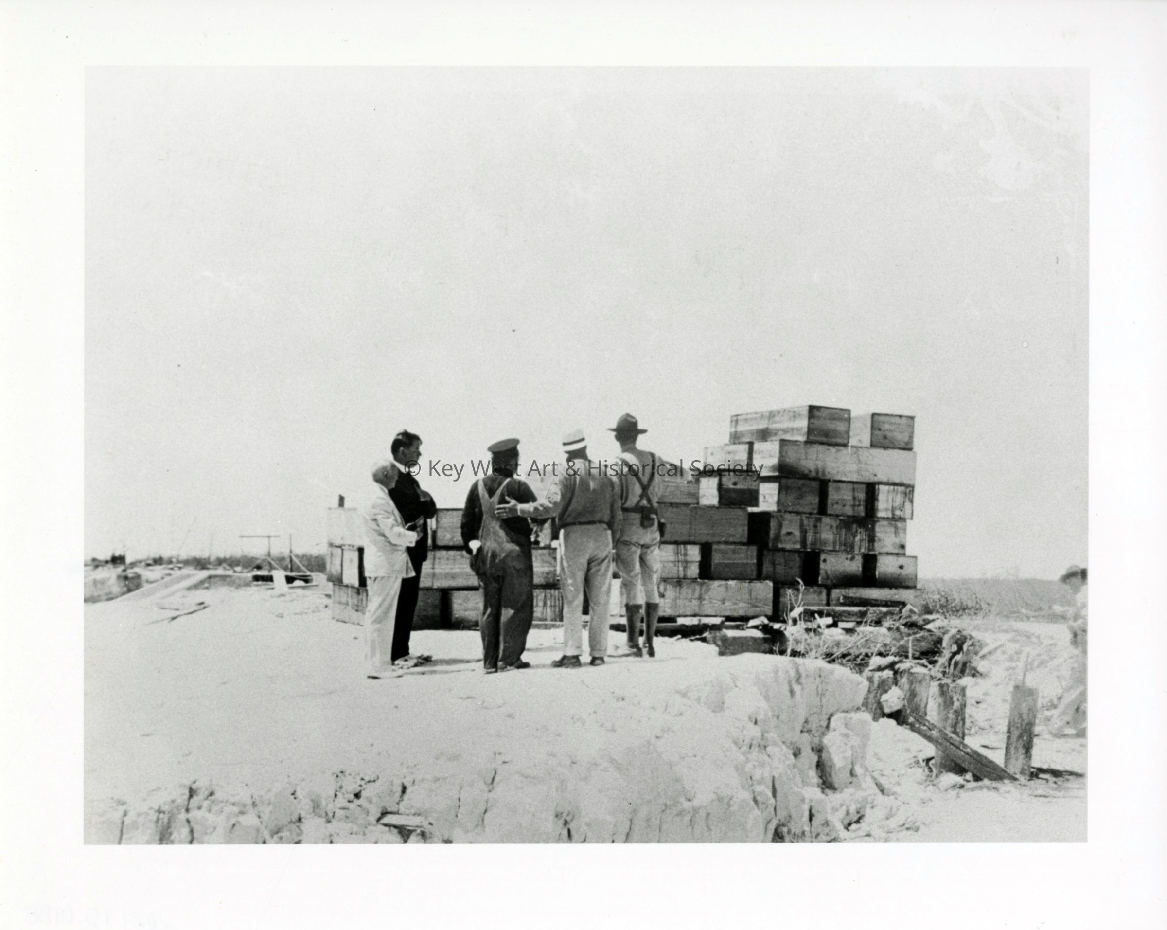 Black and white photograph of destruction caused by the Labor Day Hurricane and the recovery of bodies. Men standing alongside stacked coffins.