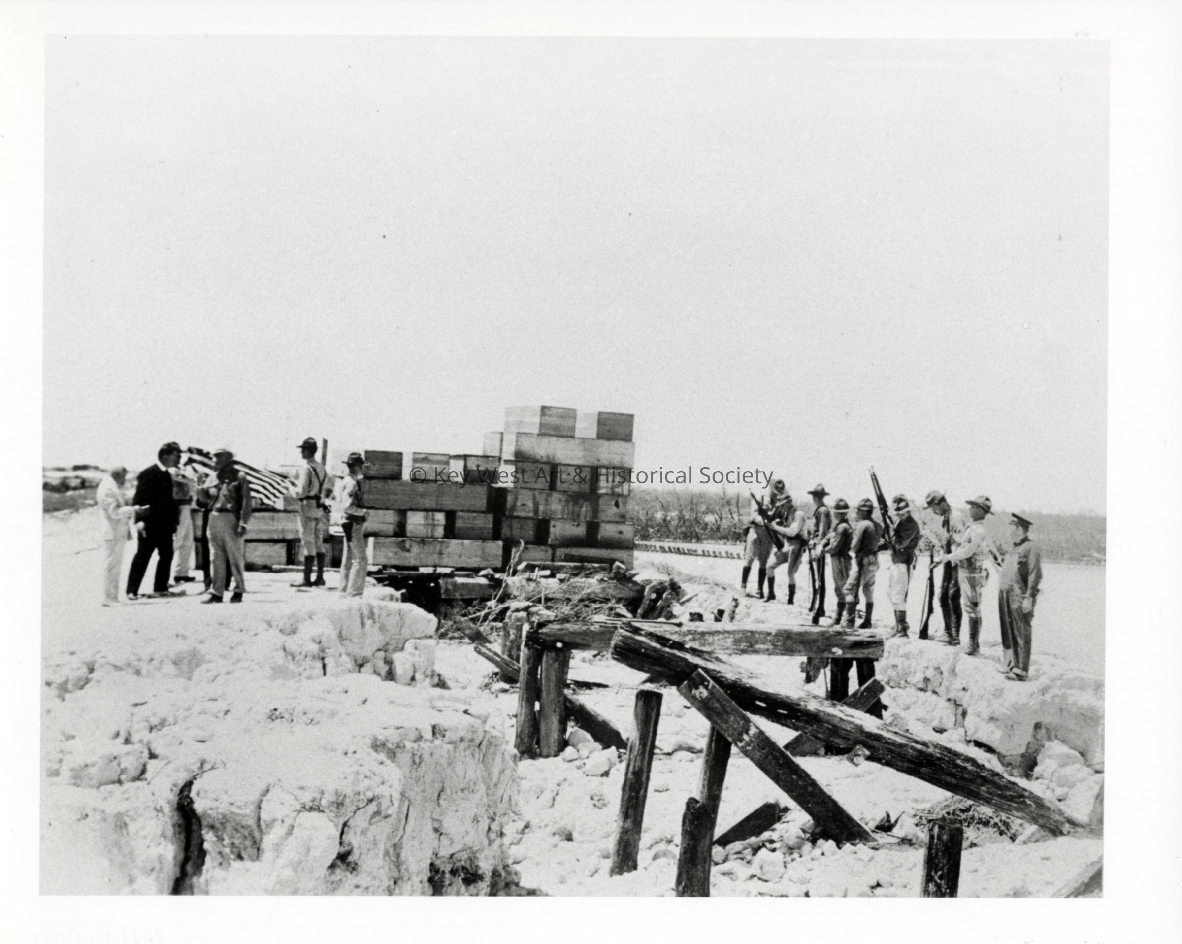 Black and white photograph of destruction caused by the Labor Day Hurricane and the recovery of bodies. Men standing alongside stacked coffins.