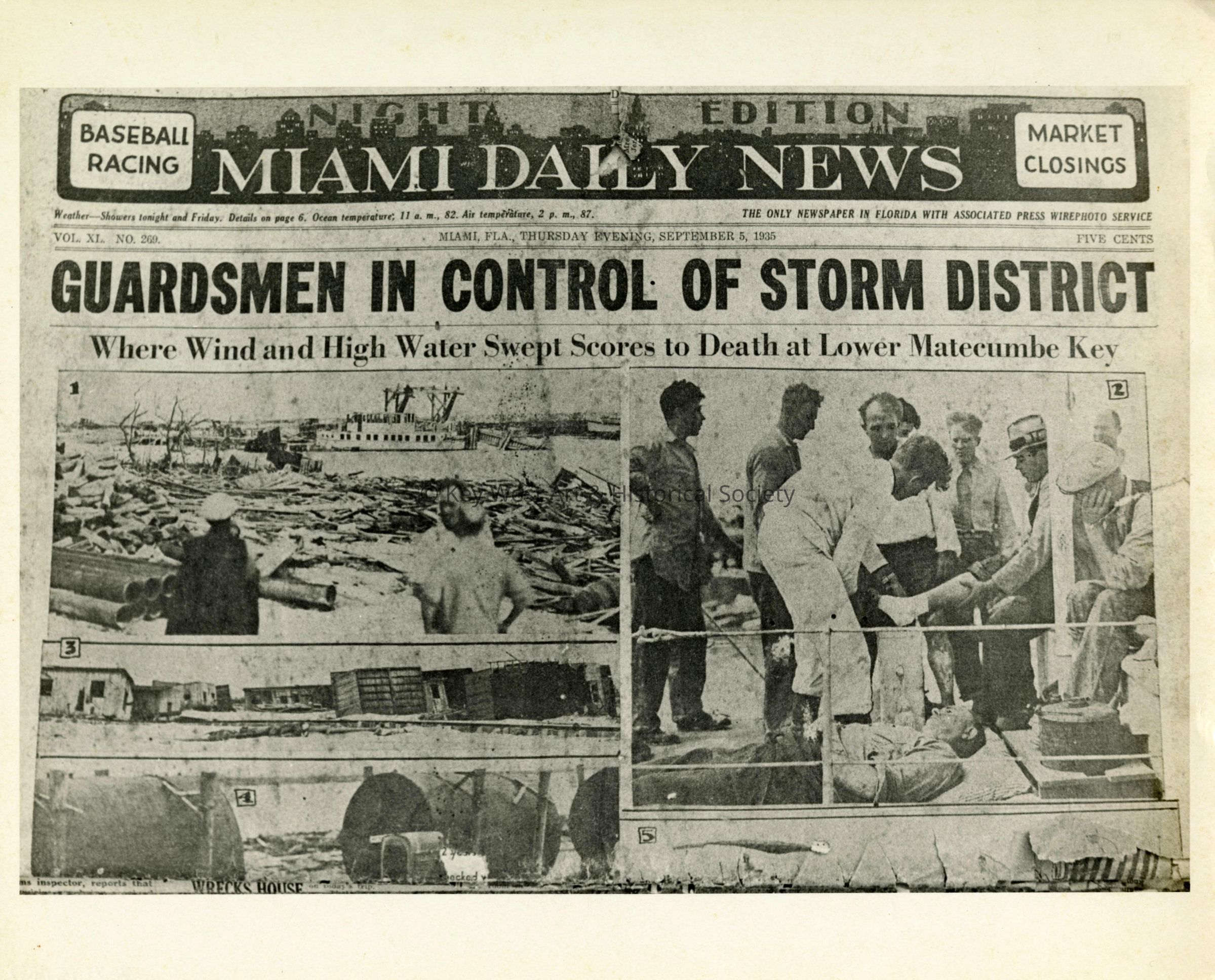 Black and white photograph of the front page of the Miami Daily News detailing the destruction and casualties caused by the Labor Day Hurricane.