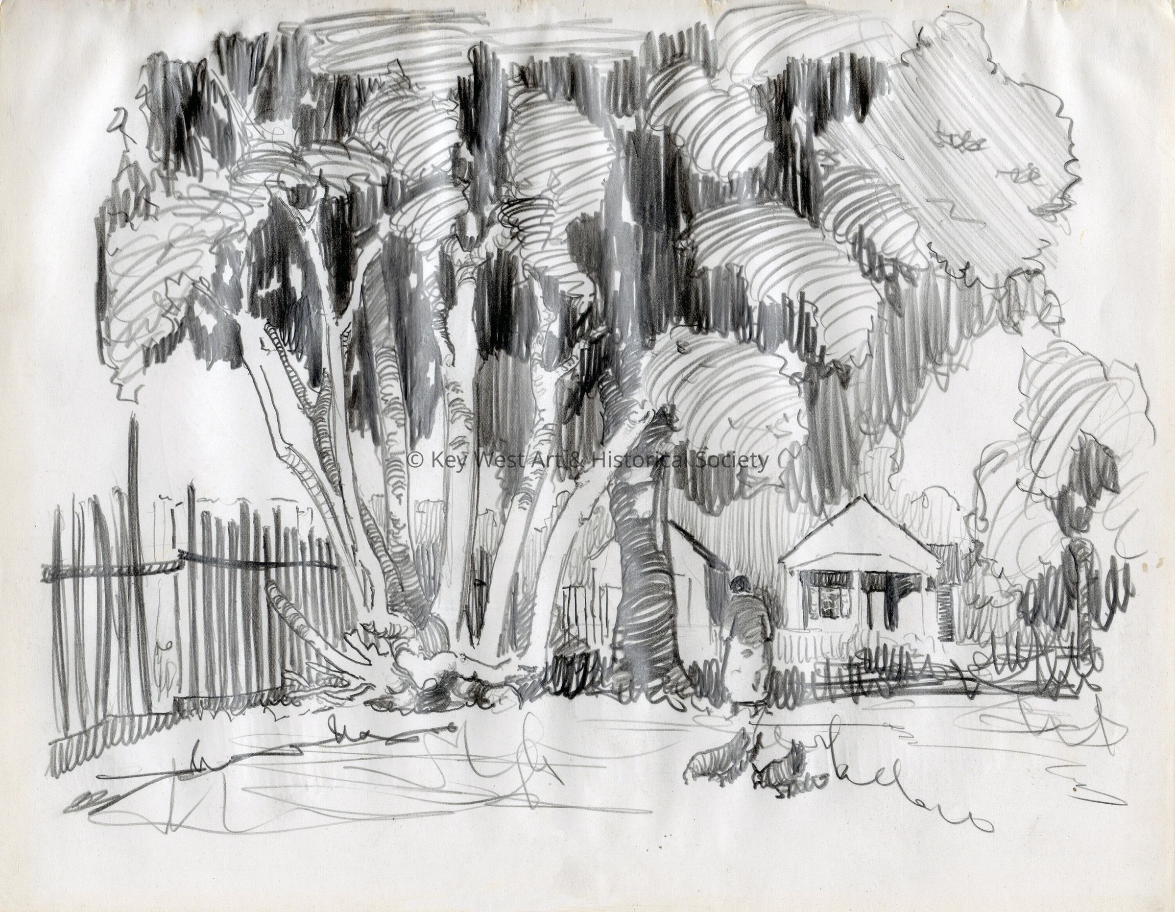 Pencil drawing on paper of a big tree with a lady standing under it. There is a wooden fence behind the tree and a house in the background. Framed and matted.Type of Drawing