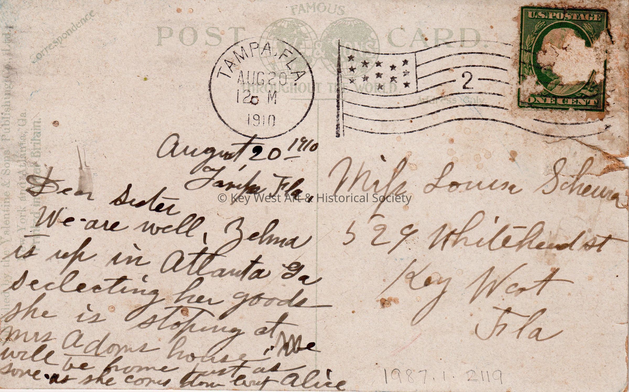 Postcard depicting a streetcar on a city street. The caption reads, ‘Lafayette Street, Tampa, Florida.’ The message on the verso reads, ‘August 20, 1910, Tampa, Florida, Dear Sister, We are well. Zelma is up in Atlanta, Georgia, selecting her goods. She is stopping at Mrs. Adams house and we will be home just as soon as she comes down coast, Alice’. The card is addressed to Louisa Scheurer, 529 Whitehead Street, Key West, Florida, and is postmarked Tampa, Florida, August 20, 1910.Subject Place