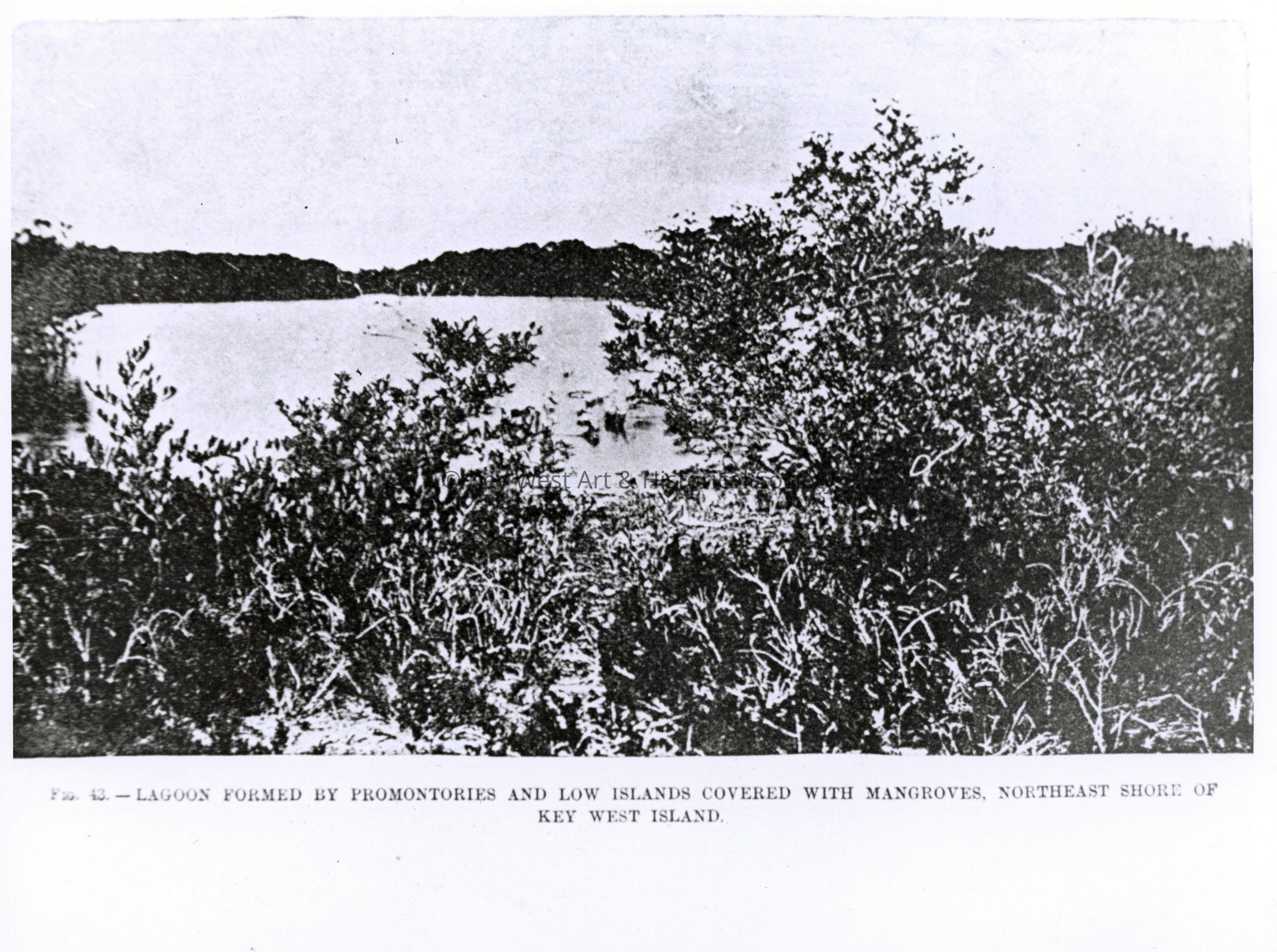 Black and White photo of the waters off the northeast side of Key West. Caption reads, 'Lagoon formed by promontories and low islands covered with mangroves, northeast shore of Key West Island.'