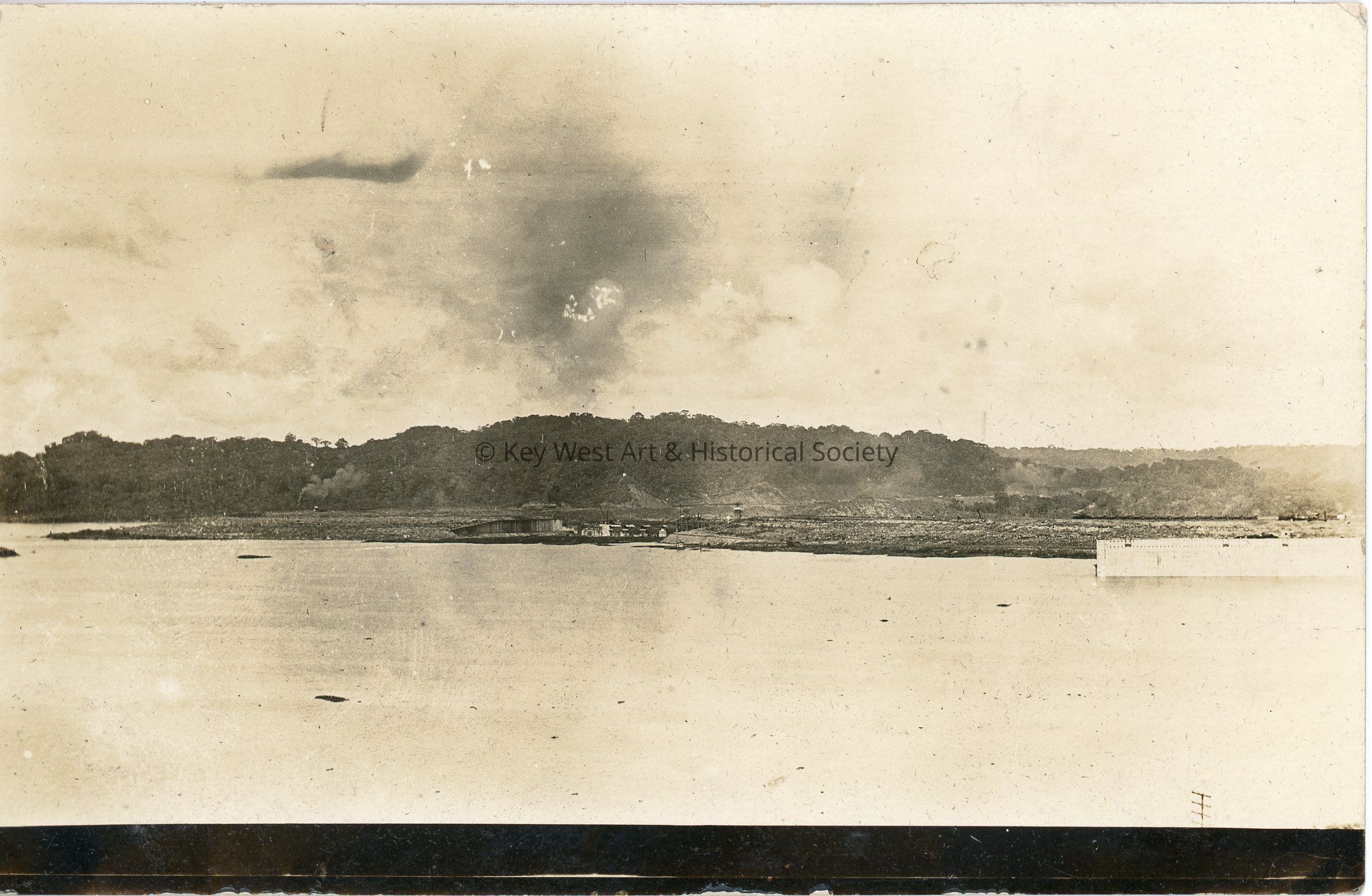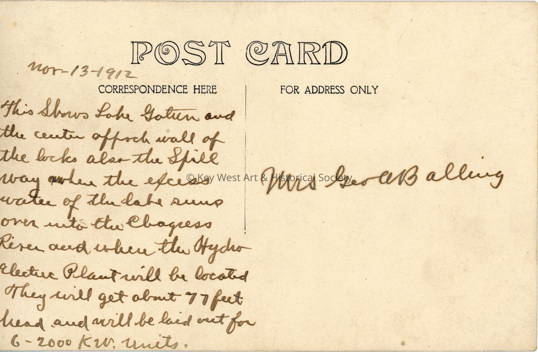 Black and white photograph postcard depicting Lake Gatun and the center approach wall of the Panama Canal locks and spillway. The lake and dam of the same name were created during the construction of the Panama Canal. The postcard is dated November 13, 1912 and is addressed to Mrs. Geo. A. Balling and includes a handwritten note.Subject