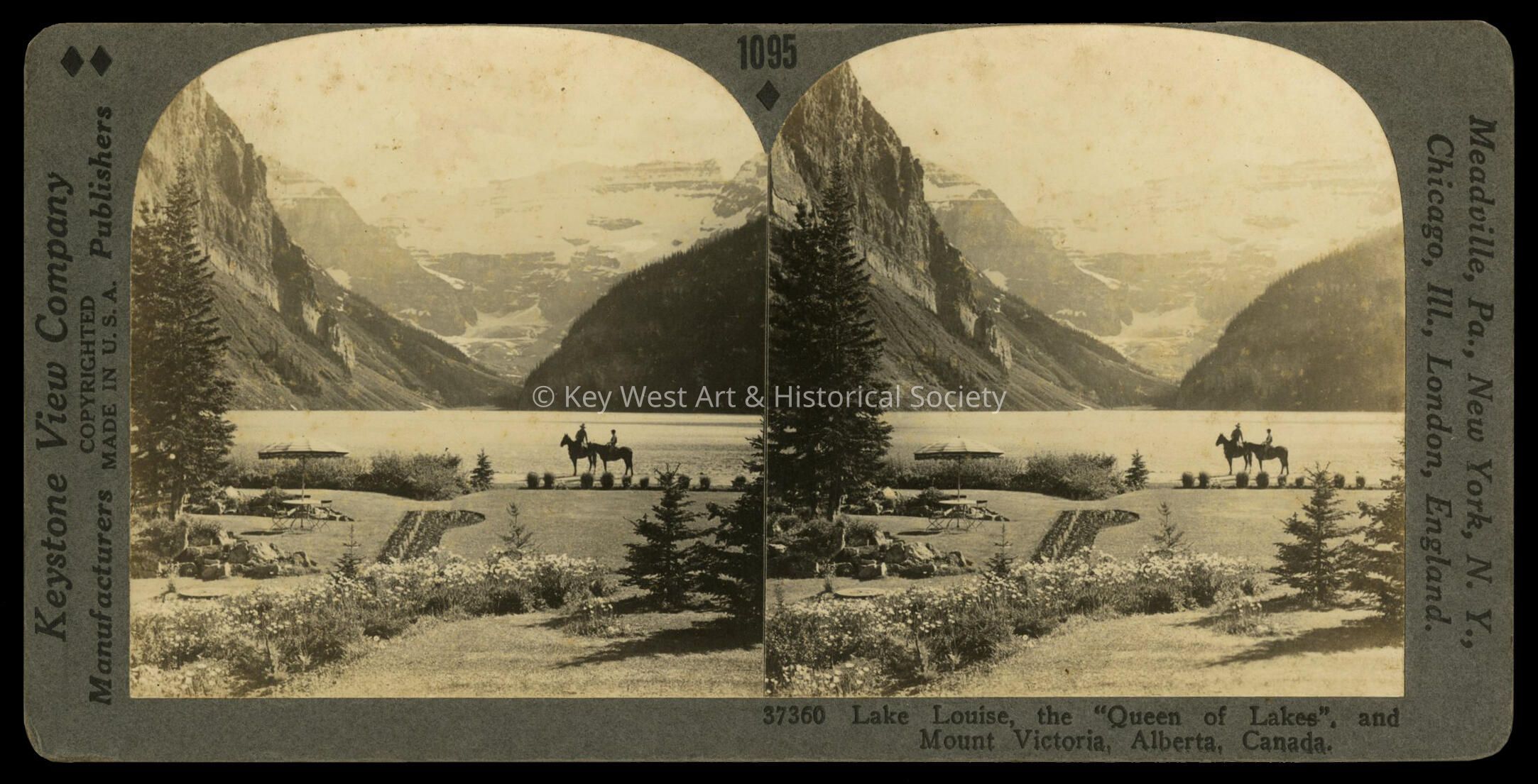 Black and white stereoview of Lake Louise, the 'Queen of Lakes', and Mount Victoria, Alberta, Canada. Extensive description printed on verso.Collection