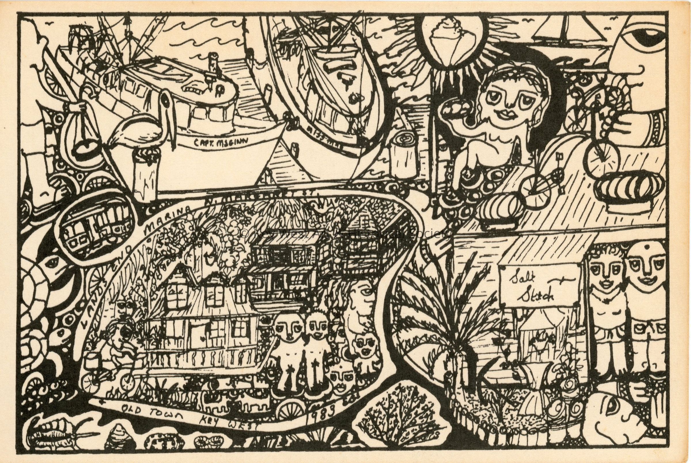 Postcard with a black and white drawing titled 'Lands End Marina N. Margaret St. & Old Town Key West' signed EBS. The drawing depicts shrimping boats, roughly drawn men and women, Key West homes, and a structure with the sign 'Salt Stick.'Subject Place
