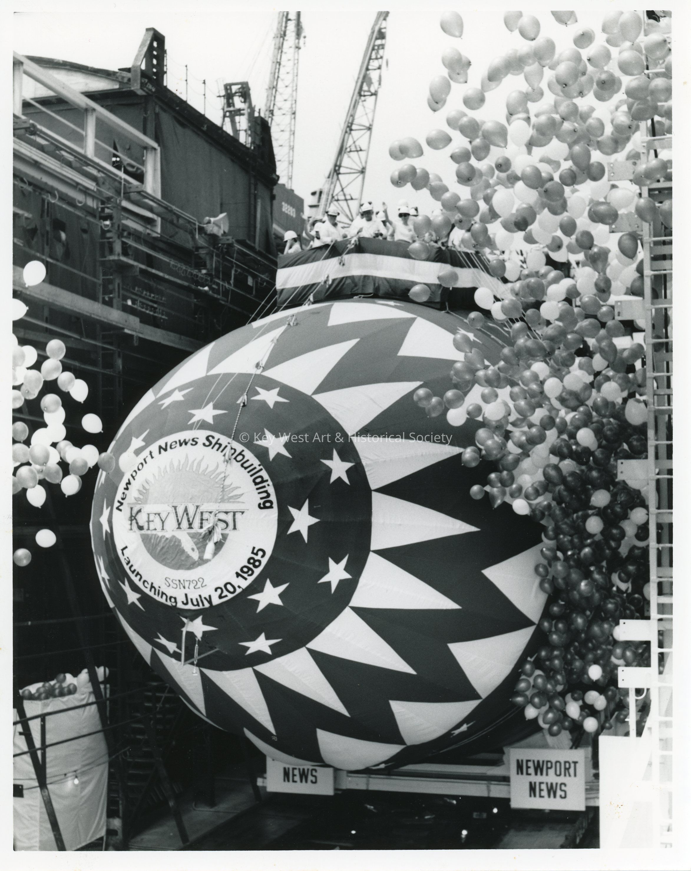 Black and white photograph of the launch of the USS KEY WEST (SSN-722) at Newport News, Virginia.
