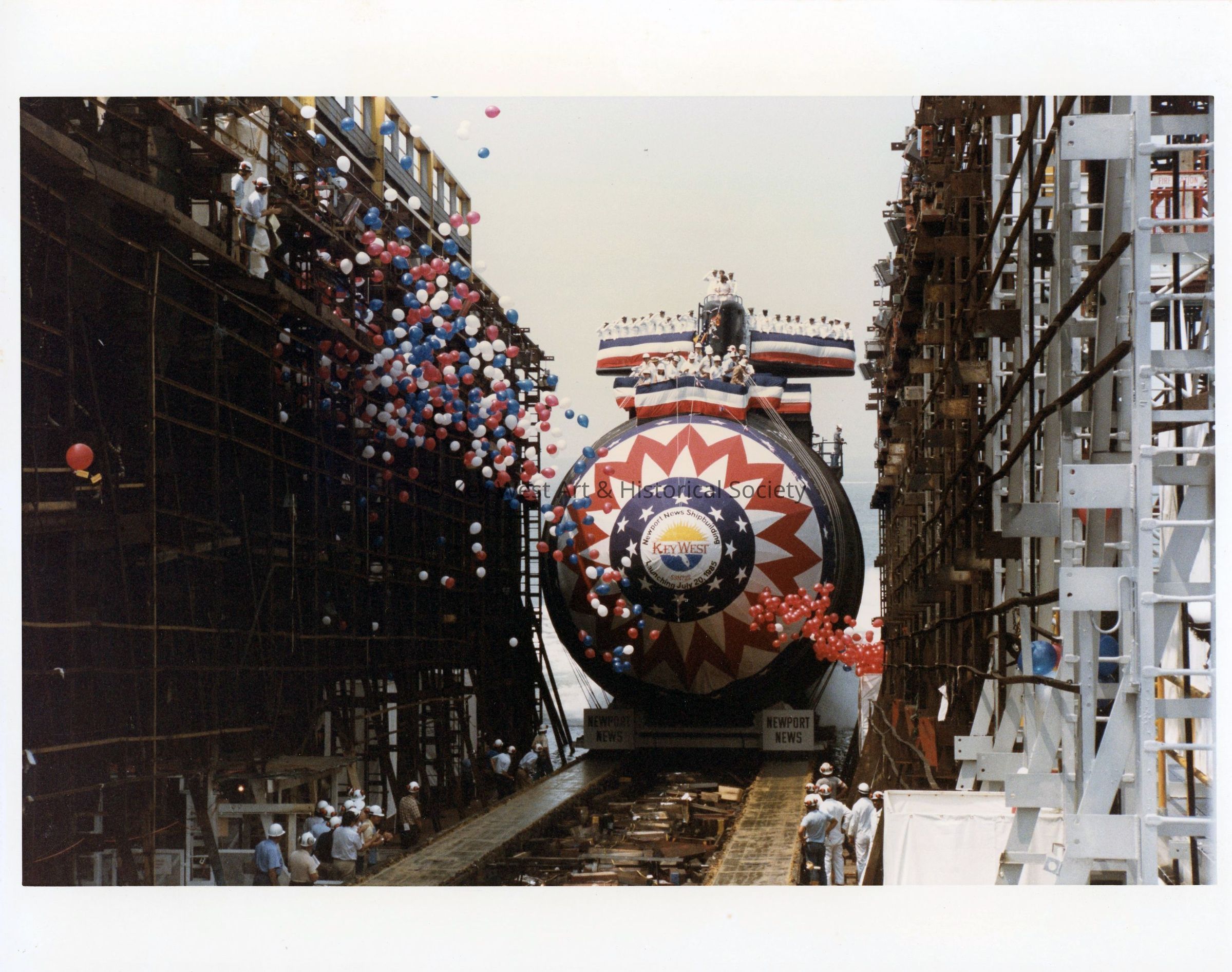 Color photograph of the USS KEY WEST (SSN-722) being launched down the marine railway at Newport News, Virginia.
