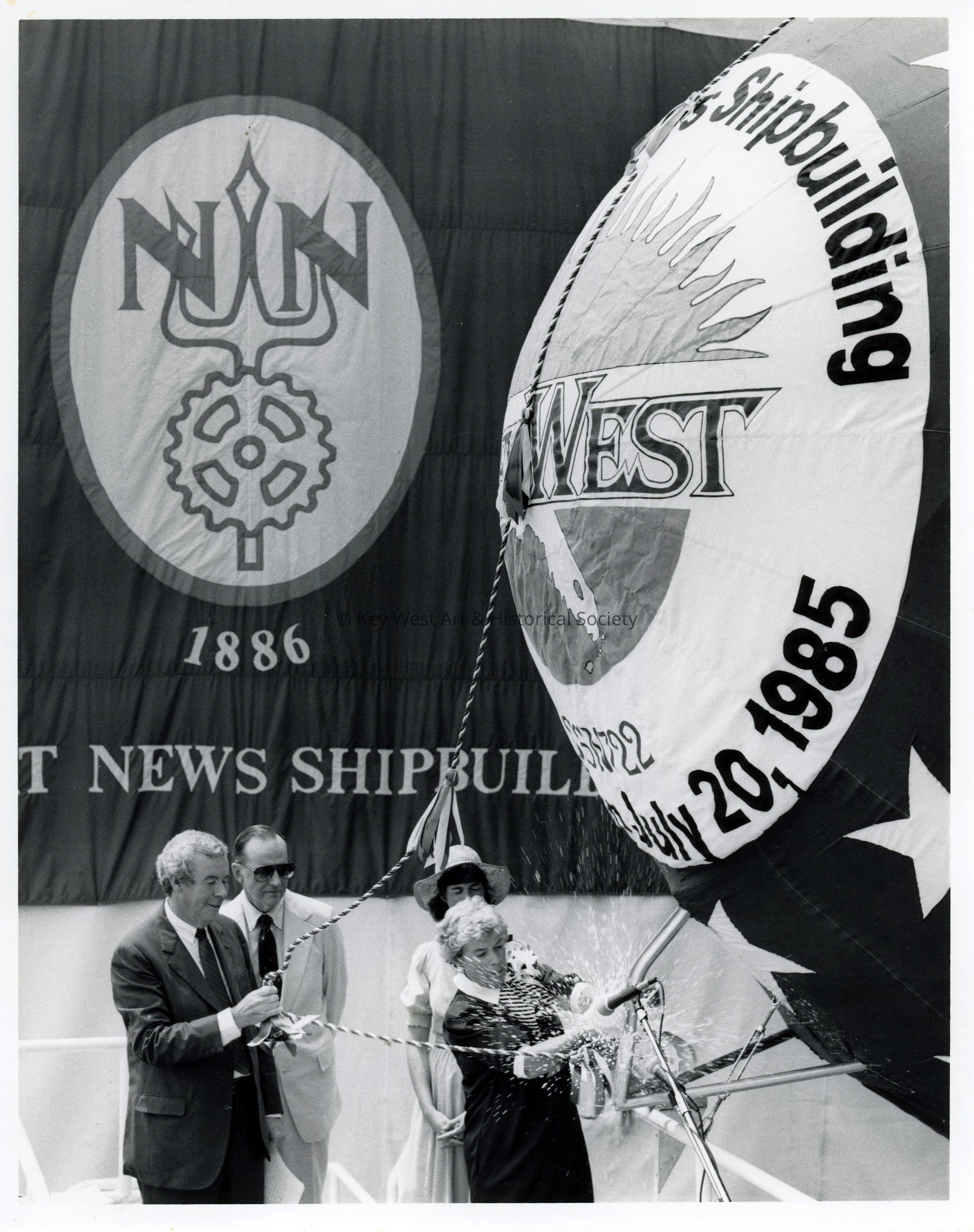 Black and white photograph of the christening of the USS KEY WEST (SSN-722) during the launch ceremony at Newport News, Virginia.