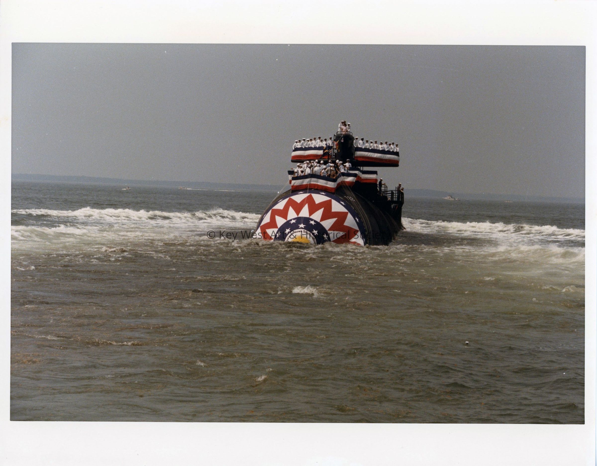 Color photograph of sailors aboard the USS KEY WEST (SSN-722) following her launch at Newport News, Virginia.