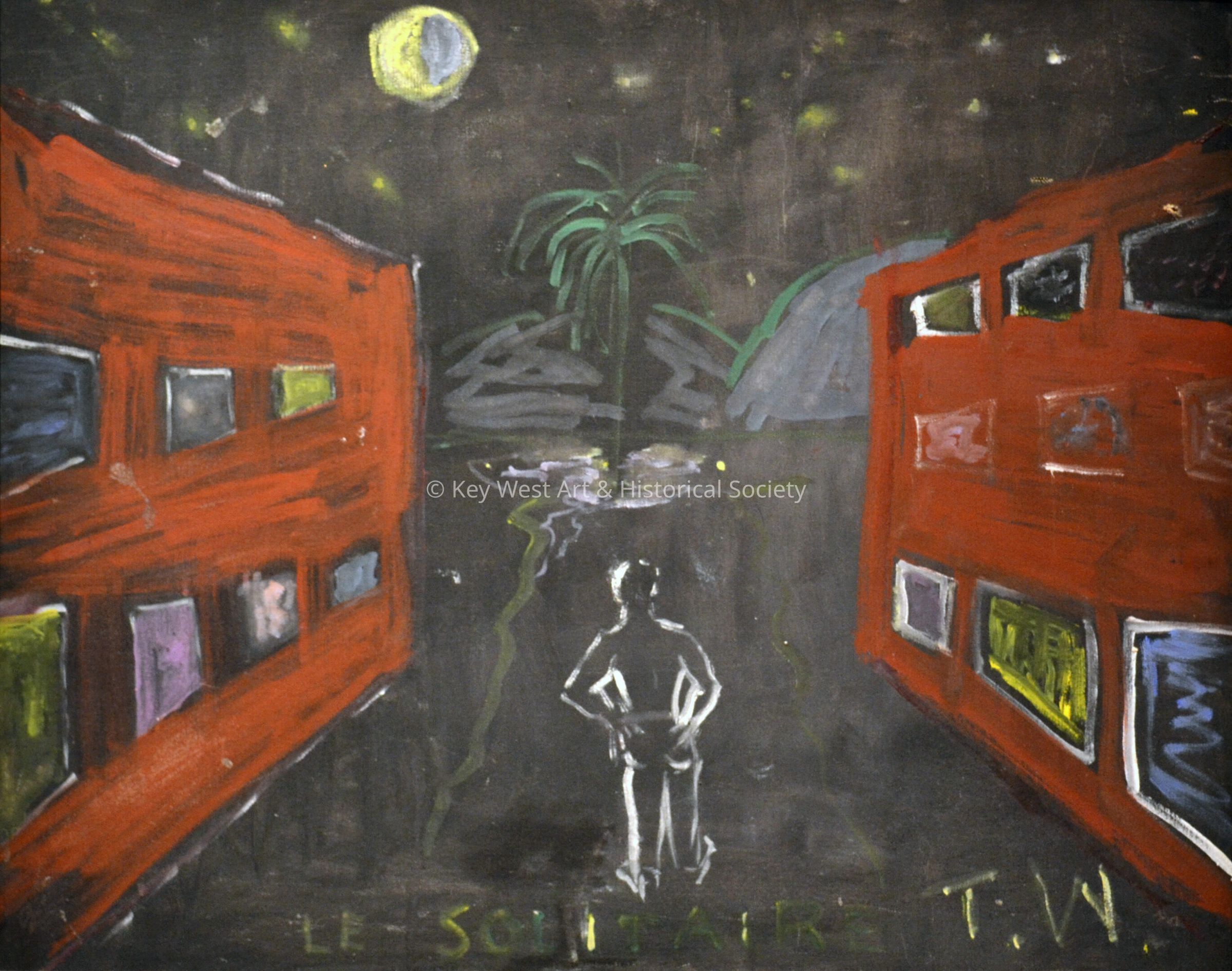 Oil on canvas by Tennessee Williams depicting a lone figure standing on a path between two buildings. The figure, who is likely Williams, walks with his hands on his hips in the dark. Williams' bouts of depression frequently made him feel isolated.Type of Painting