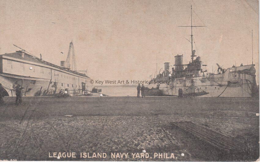 Postcard depicting a building and ship on the docks. The caption reads, ‘League Island Navy Yard, Philadelphia.’Collection