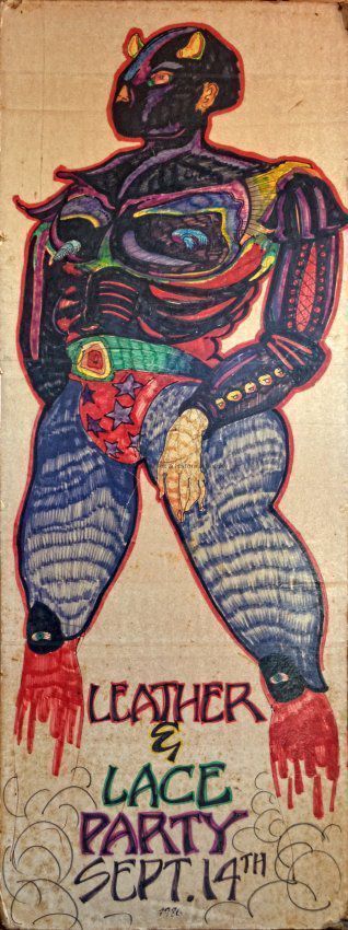 Marker painting by Van Eno depicting a man dressed in a leather suit that was displayed at the entrance to a Leather & Lace Party at the Copa Club on Duval Street.Type of Painting