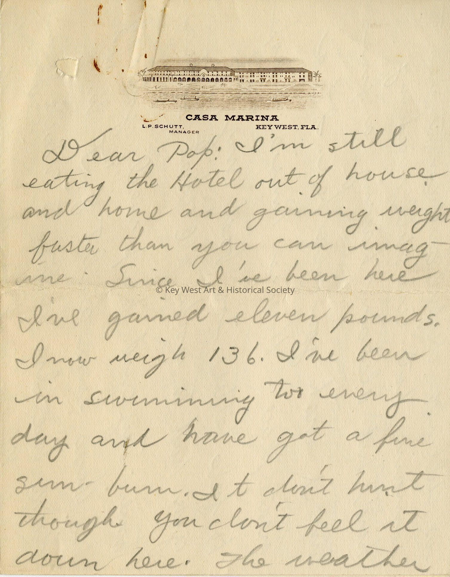 Handwritten folded letter on Casa Marina Hotel stationery. Letter was written by James Buckley to his father during the former's time working at Casa Marina during the winter of 1928-1929. Letter reads, 'Dear Pop: I'm still eating the Hotel out of house and home and gaining weight faster than you can imagine. Since I've been here I've gained eleven pounds. I now weigh 136. I've been in swimming too every day and have got a fine sun-burn. It don't hurt though. You don't feel it down here. The weather is still wonderful and continues to remain hot. Am still working hard but also am having a fine time. I wish you were here. It's a great place. How is Russie. I hope he feels better. Too bad, my pop, you had to work all that extra time. Try and keep well yourself as there's even a lot of "flu" down here. I've written to Uncle John and Uncle Rich and will write to Uncle Jim & Gandy when I get a chance. Received a fine letter from Uncle Jim. Everyday I have a little talk with the baker. He's a German and a fine man. He always asks me, "Vell Chimmie, How many rolls you eat joost now? When I say "Oh, baker, only about 6 or 7, he says "Mein E-olt. Vot an appetite dot boy has got. He says if it wasn't for me, he wouldn't have no job down here (you're glad to hear that I know my Pop). Well I'll close now hoping to hear from you real soon, and I'll write again myself. Goodbye my Popski. Loads of love and kisses from your Jimo."Collection