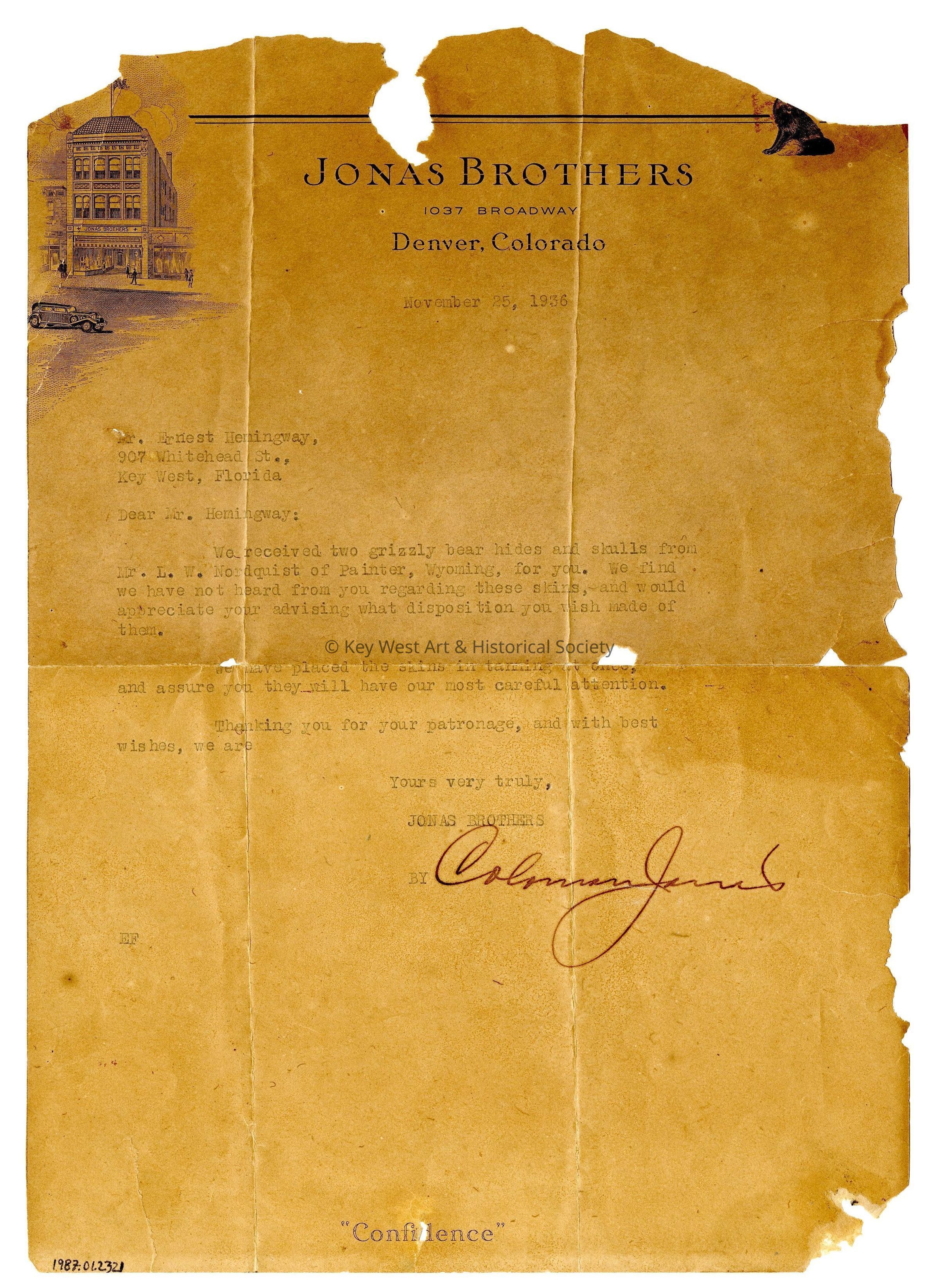 Typed letter on Jonas Brothers letterhead illustrated with an illustration of the company's headquarters building in Denver, Colorado. The letter is addressed to Ernest Hemingway regarding taxidermy on two bear hides and skulls that appear to be a gift from Mr. L.W. Nordquist of Painter, Wyoming.Collection