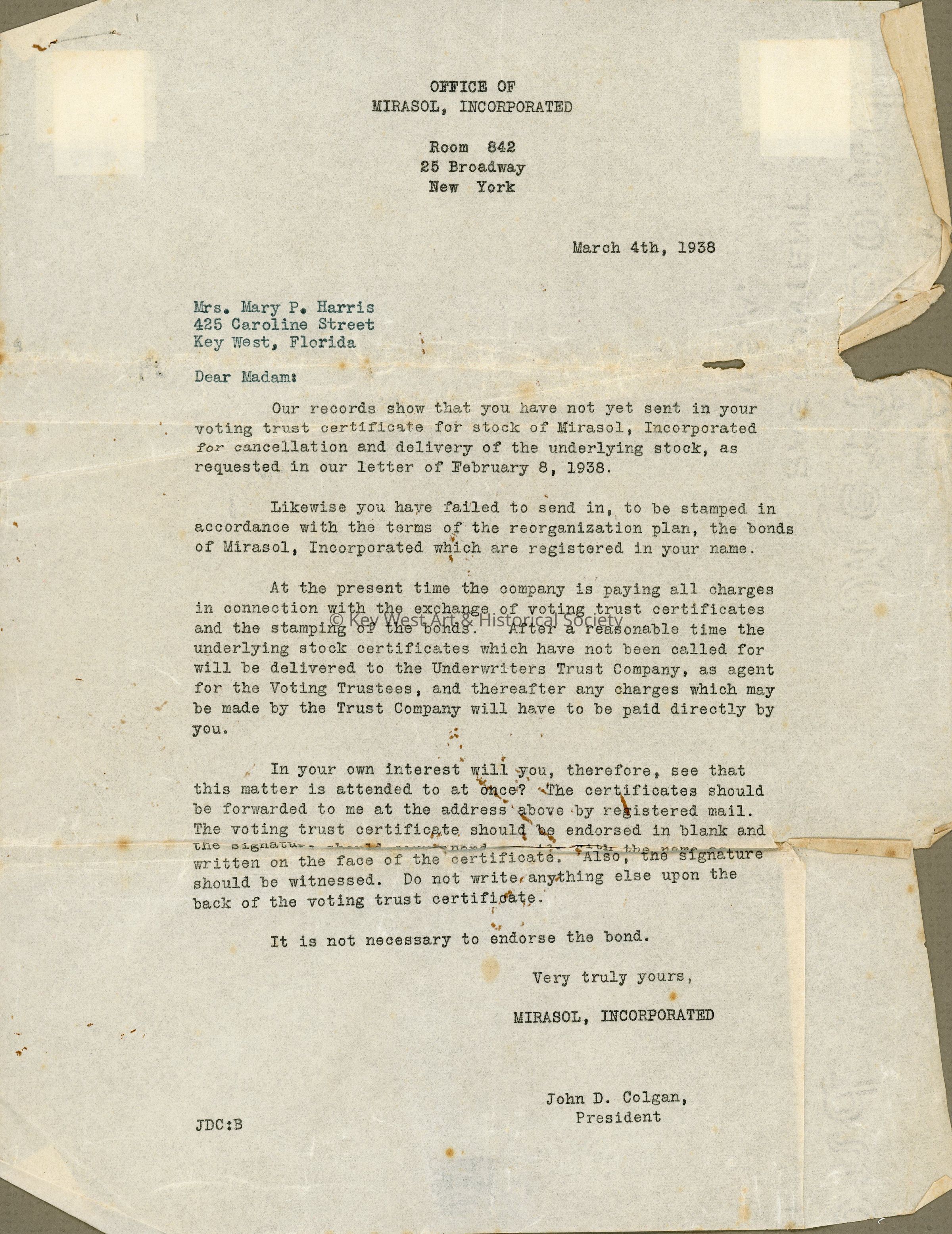 Typed letter from John D. Colgan, the President of Marisol, Incorporated to Mrs. Mary P. Harris. The letter is in regards to voting trust certificates and bond stamping. The letter was stuck to a board for display in Wachovia Bank. The bank was formerly located at 420 Front Street.Collection