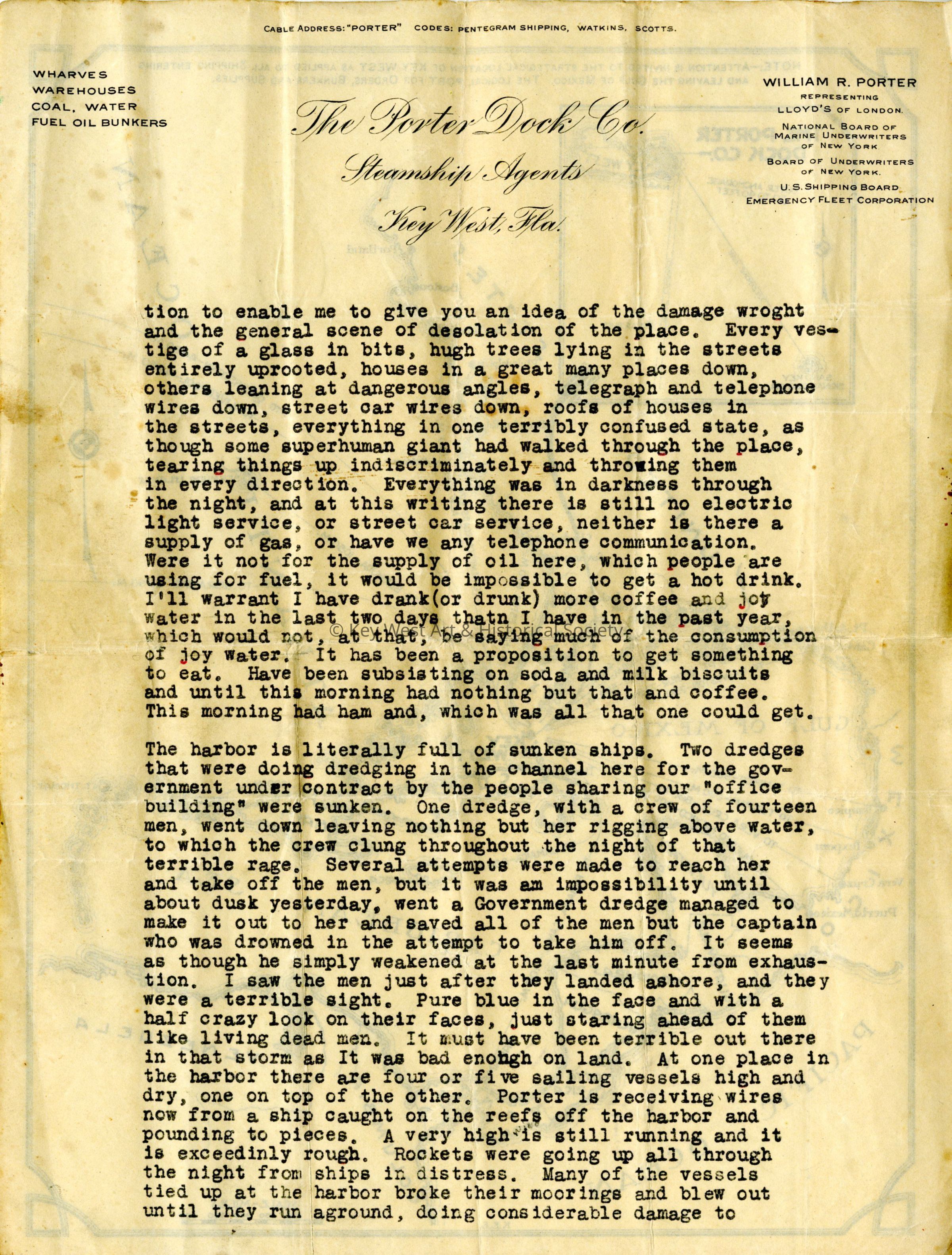 Page two of a three page typed letter on The Porter Dock Company letterhead from Melville Bing to his parents written after the Hurricane of 1919. Bing was an employee of the Porter Dock Company, Steamship Agents based in present-day Mallory Square. Bing describes the force of the storm and the subsequent damage in great detail.Subject Place