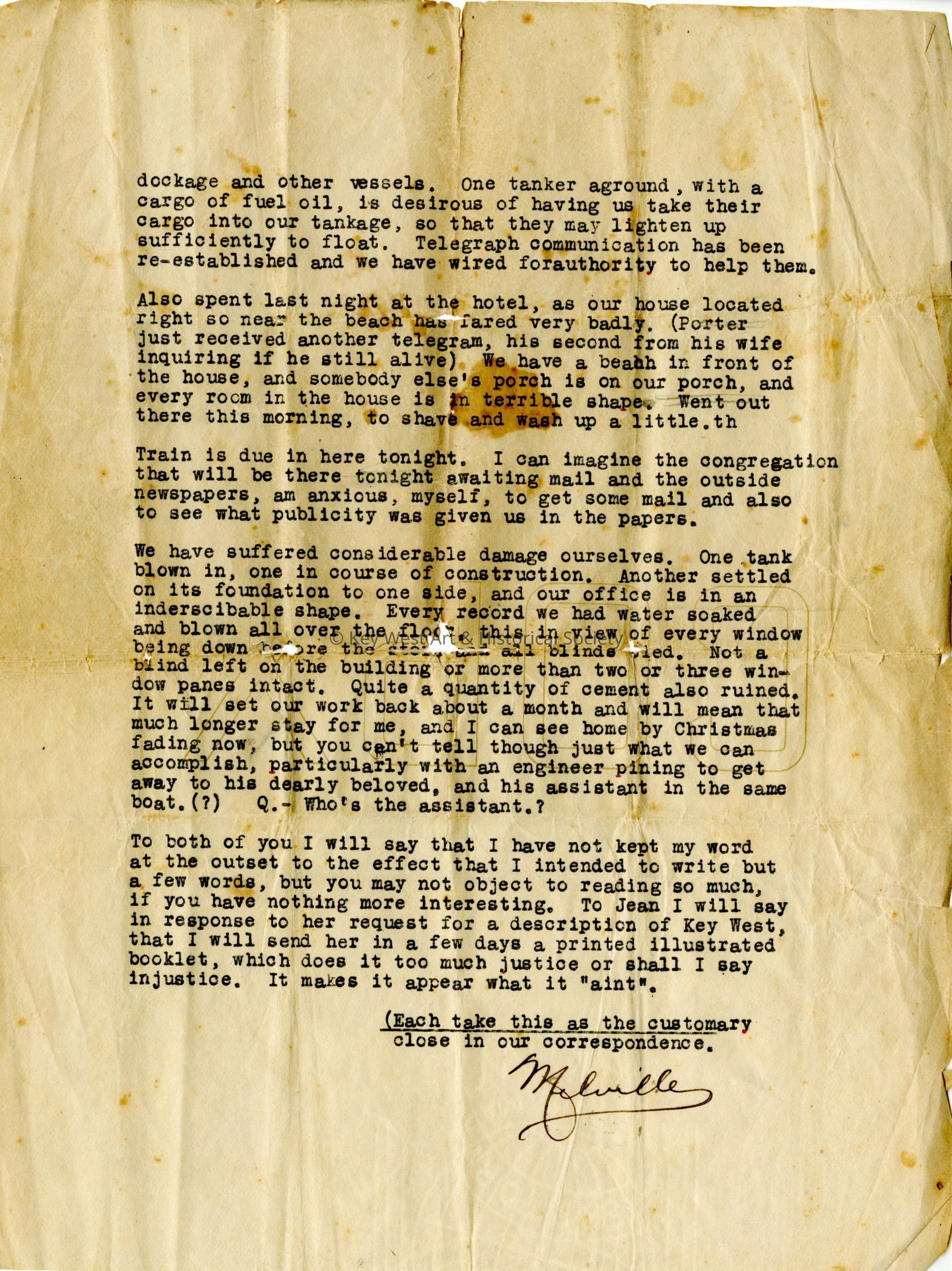 Page three of a three page typed letter on The Porter Dock Company letterhead from Melville Bing to his parents written after the Hurricane of 1919. Bing was an employee of the Porter Dock Company, Steamship Agents based in present-day Mallory Square. Bing describes the force of the storm and the subsequent damage in great detail.Subject Place