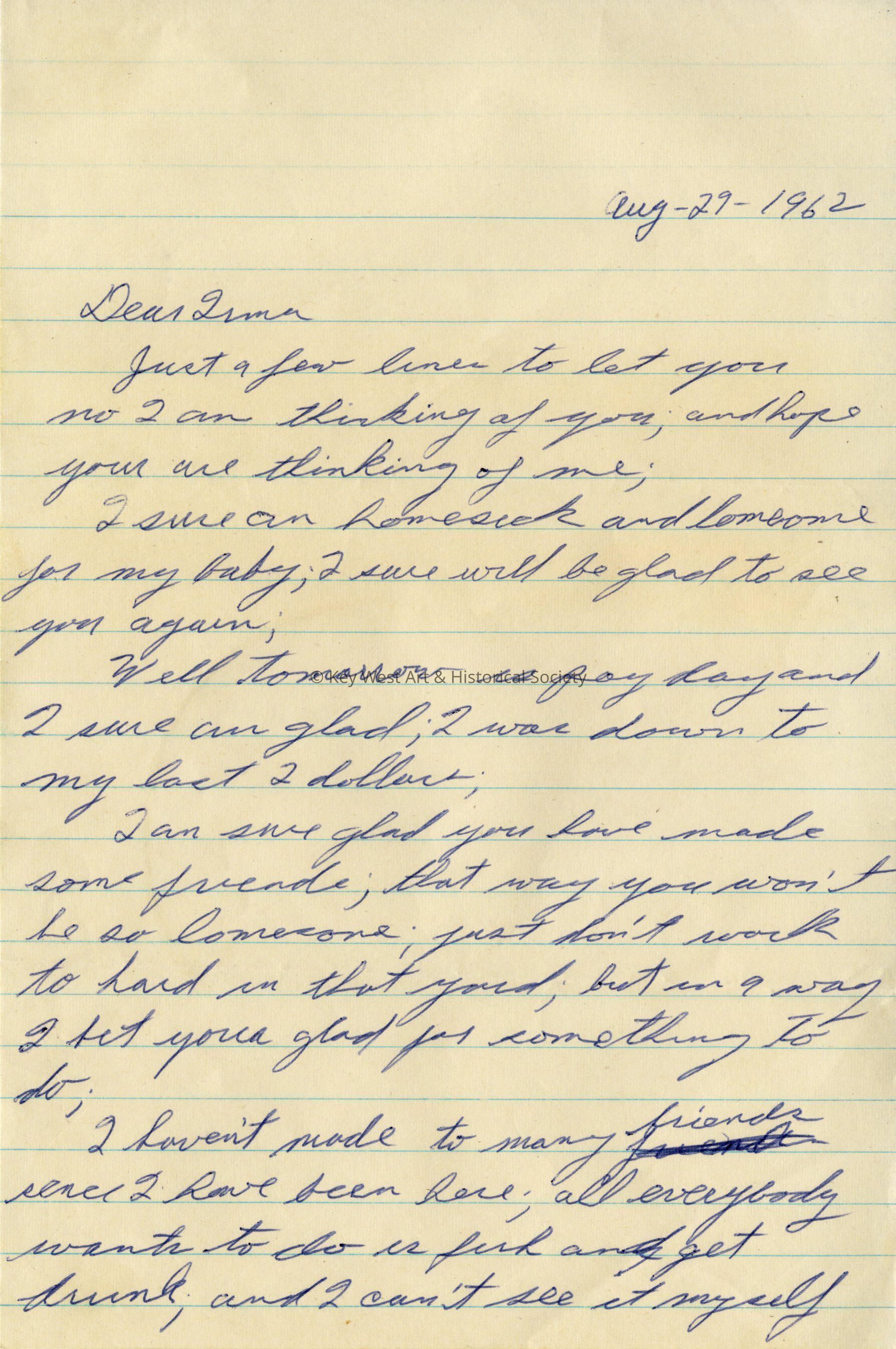 Handwritten letter from Lloyd Pine to his wife, Irma Pine, during the run up to the Cuban Missile Crisis. Pine was stationed at Naval Air Station Key West.