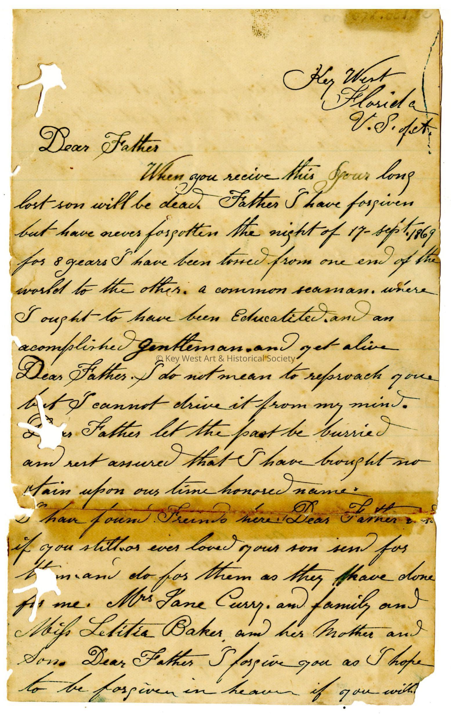 Three page letter from Roland E. St. Clare to his father written from Key West that mentions Jane Curry and Letitia Baker.
