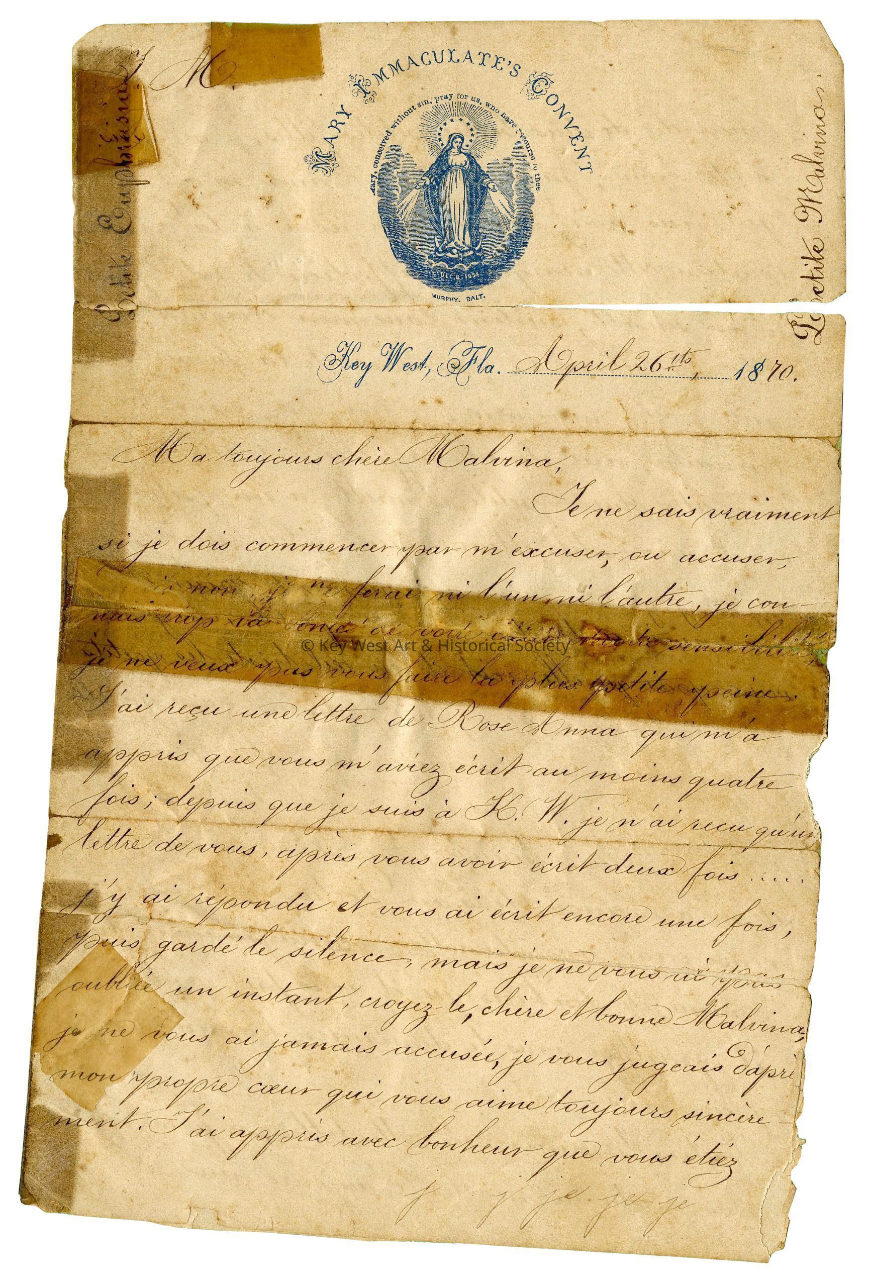 Four page handwritten letter in French from Sister M. Euphrasia, Superior of the Convent of Mary Immaculate, sent to a woman named Malvina. The letter was written on Mary Immaculate stationery with a blue insignia.Subject Person/Organization