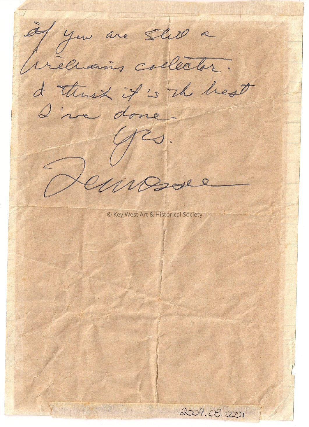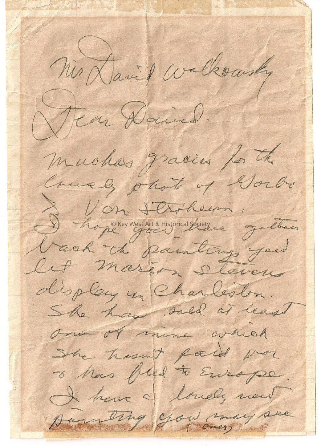 Handwritten letter to David Wolkowsky from Tennessee Williams. Reads, 'Mr. David Wolkowsky. Dear David, Muchas gracias for the lovely photo of Garbo & von Stroheim [Greta Garbo and Erich von Stroheim]. I hope you have gotten back the paintings you let Marion Stevens display in Charleston. She has sold at least one of mine which she hasn't paid for & has fled to Europe. I have a lovely new painting you may see if you are still a Williams collector. I think it is the best I've done. Yrs. Tennessee.'Collection