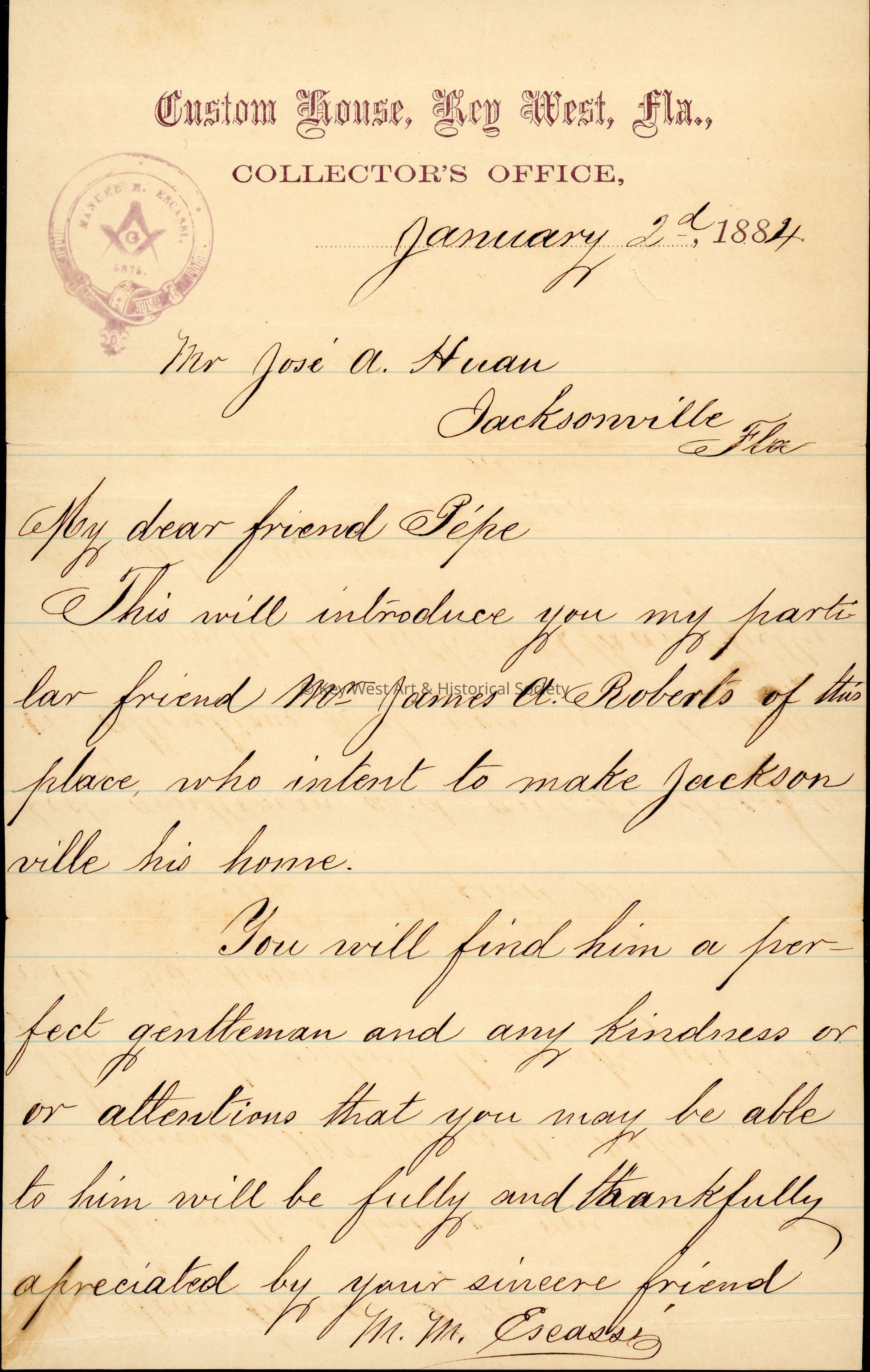 A letter from Manuel M. Escassi to Mr. Josè A. Huan. Escassi asks Huan to assist Mr. James A. Roberts who is moving to Jacksonville, Florida, where Huan lives. The letter recommends Roberts as a 'perfect gentleman.' The letter is written on Custom House stationery.Collection