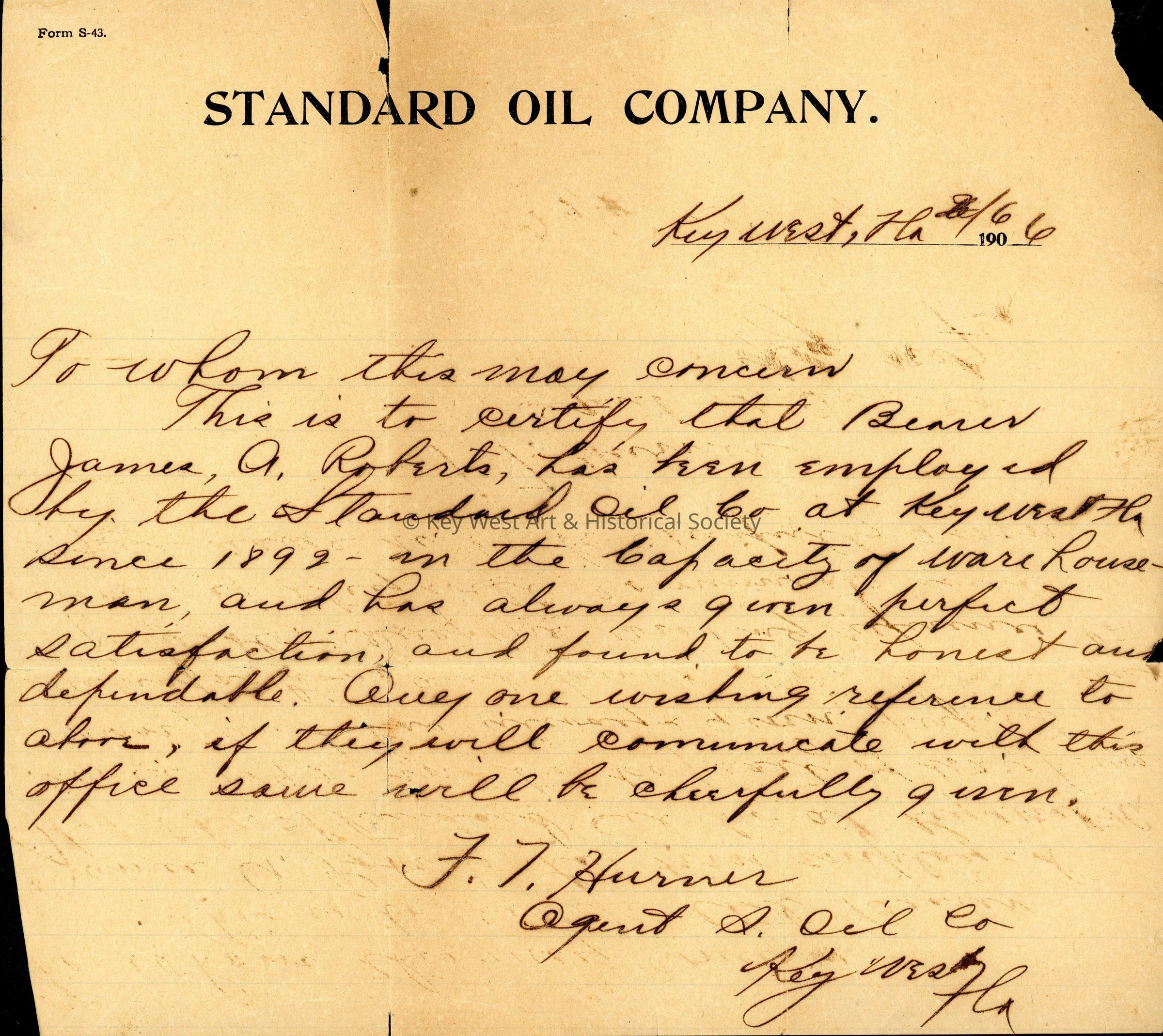A letter of recommendation for James A. Roberts from F.I. Hurnes. The letter verifies that Roberts worked for the Standard Oil Company in Key West between 1892 and 1906 as a 'warehouse man.' The letter is written on Standard Oil Company stationery.