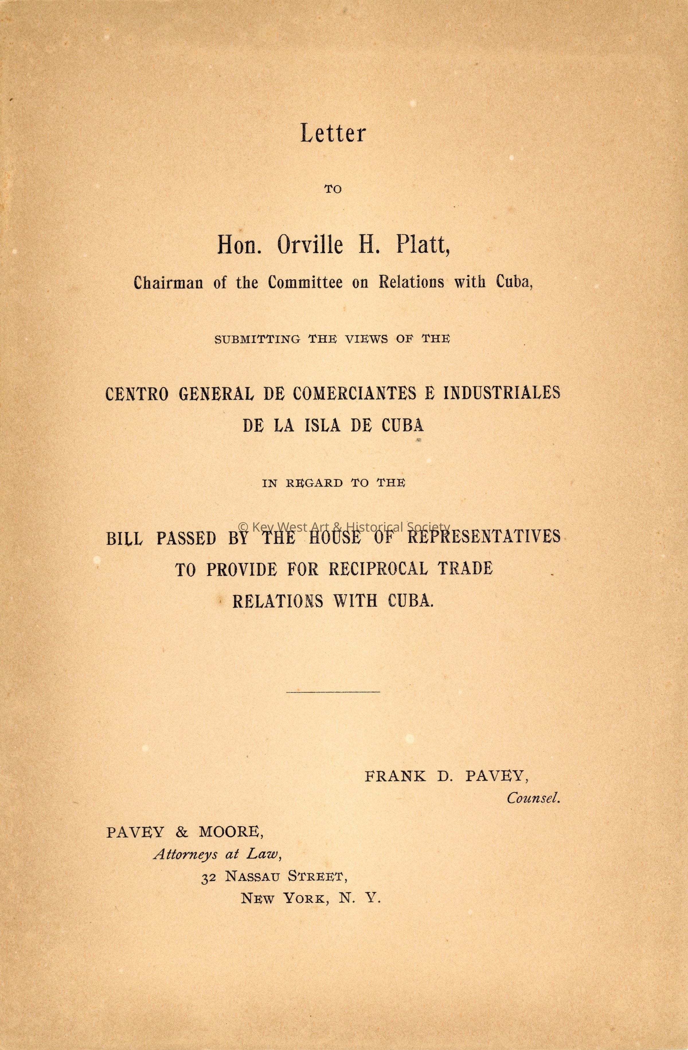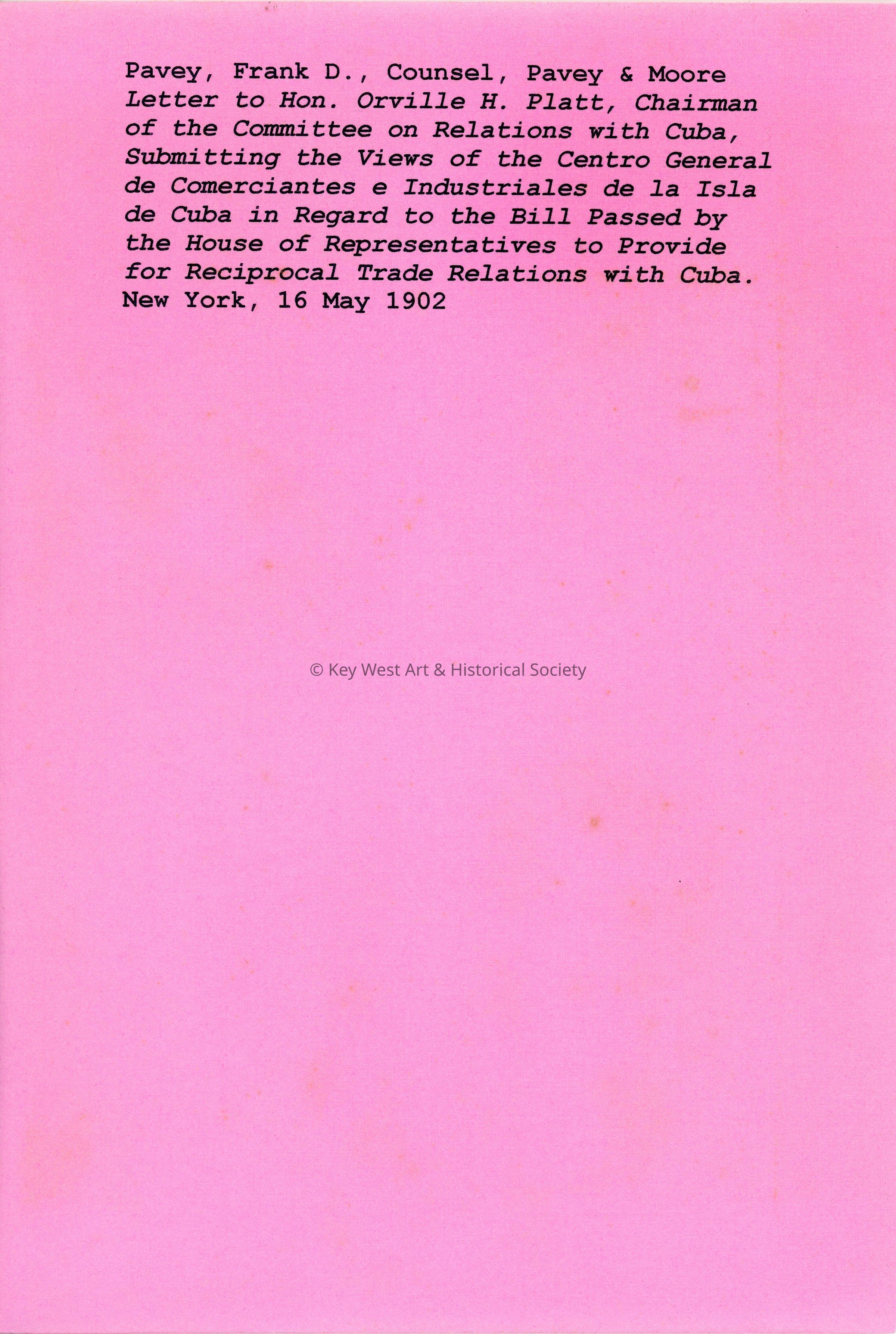 Letter to Hon. Orville H. Platt, Chairman of the Committee on Relations with CubaEntry/Object ID