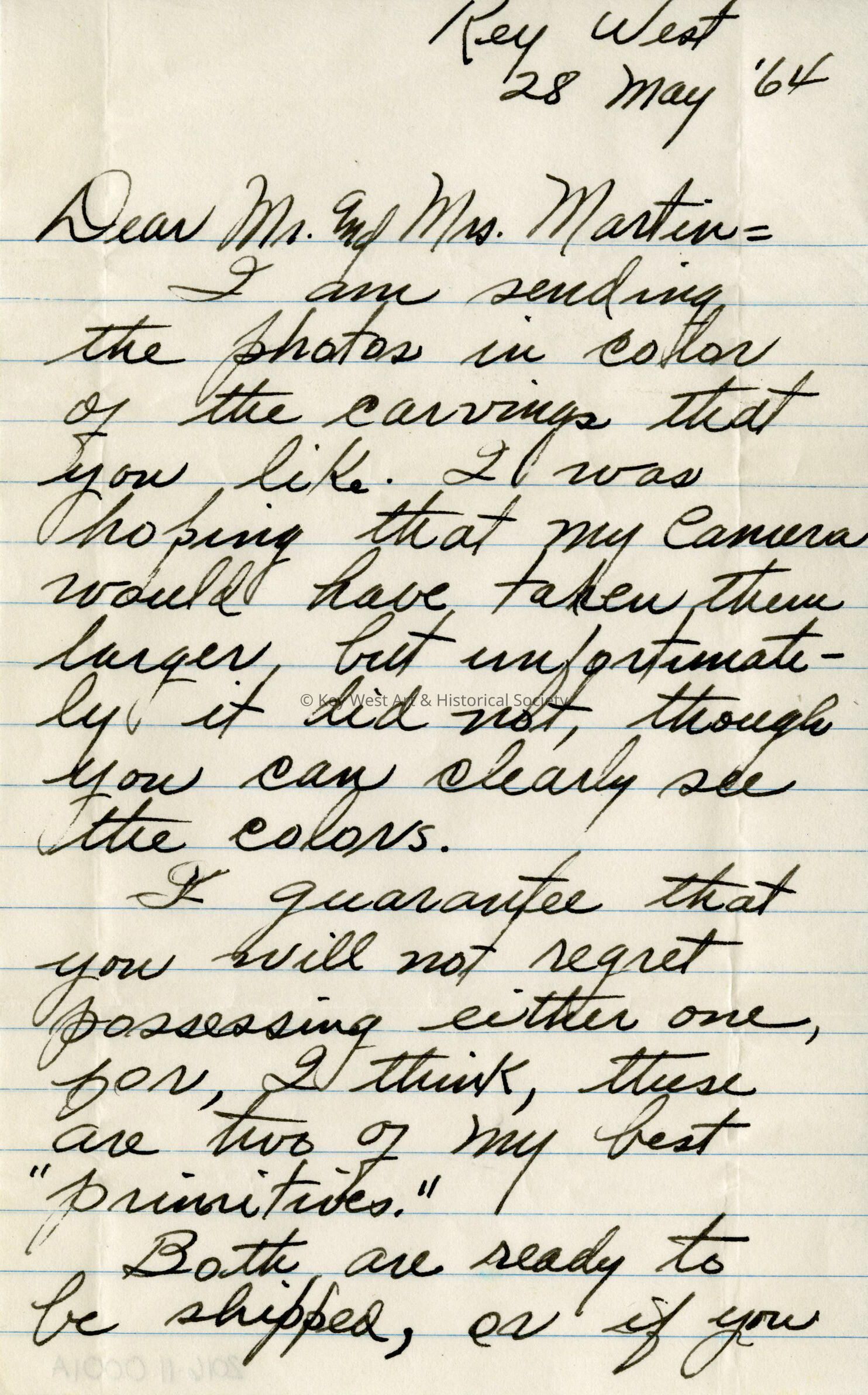 Page one of three of a handwritten letter from Mario Sanchez to Charles and Barbara Martin. The letter references carvings that Sanchez wants to sell to the couple.