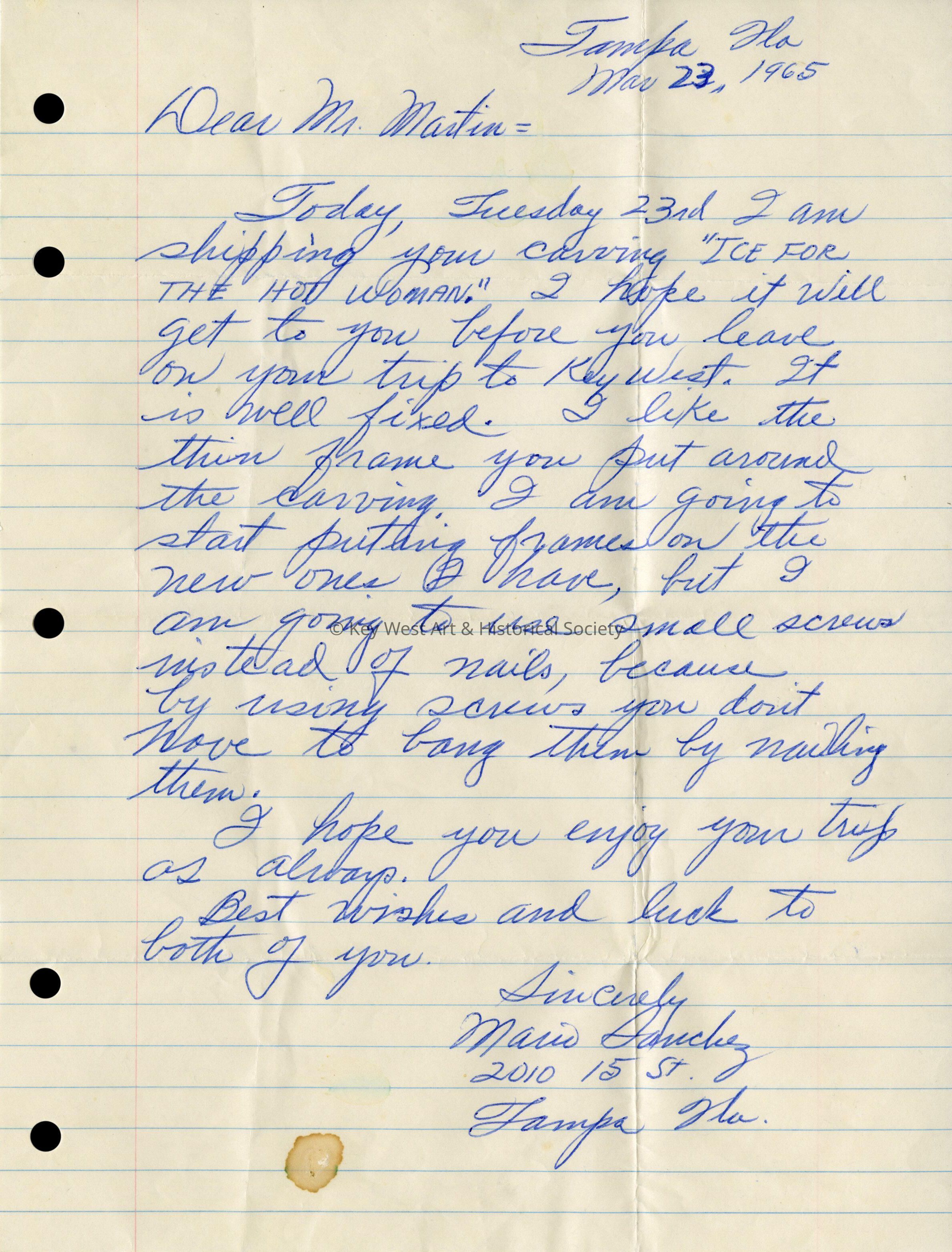 One page handwritten letter from Mario Sanchez to Charles Martin. The letter references the repair to Sanchez's carving 'Ice for the Hot Woman'.
