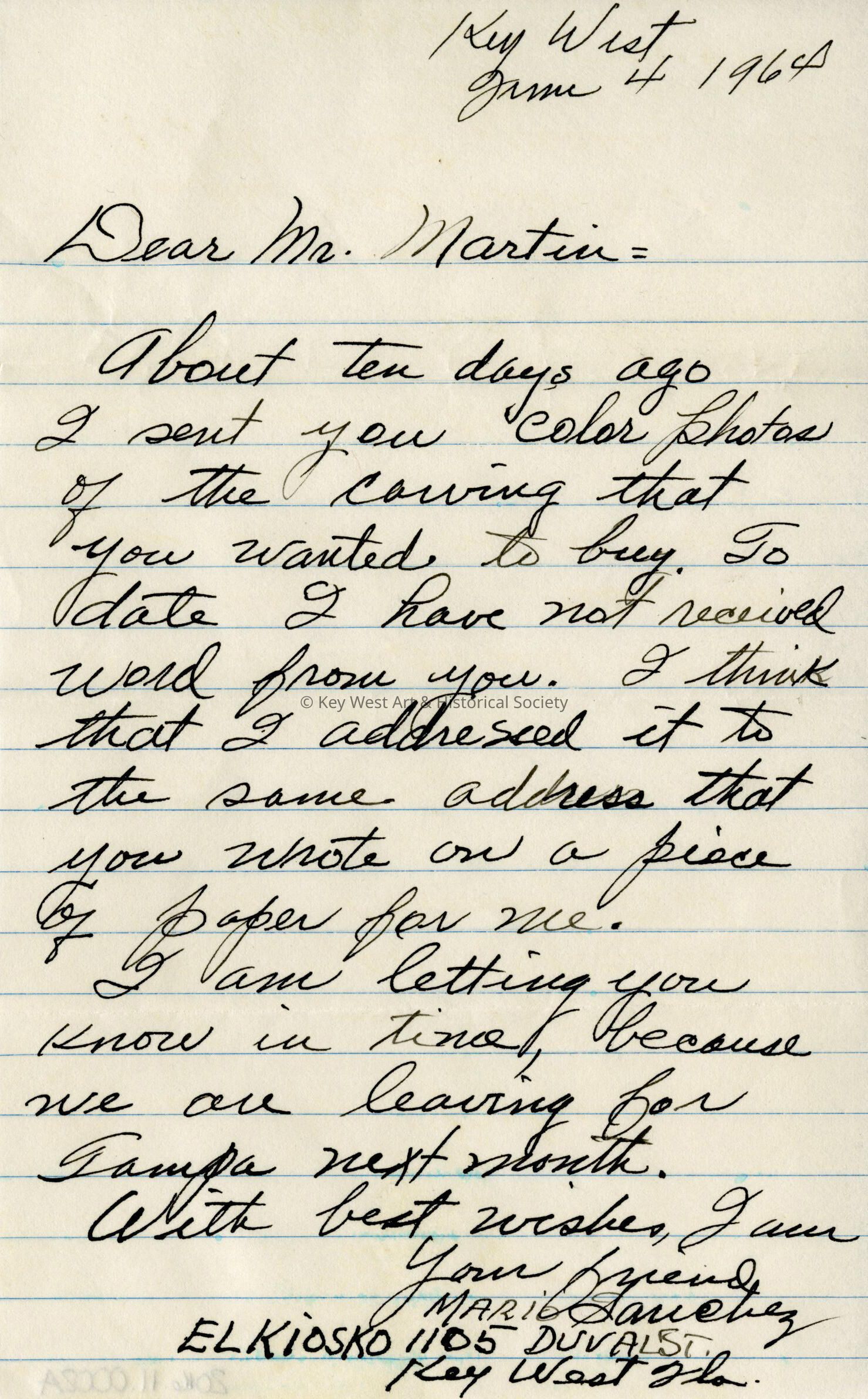 One page handwritten letter from Mario Sanchez to Charles Martin. The letter references carvings that Sanchez wants to sell to the couple.