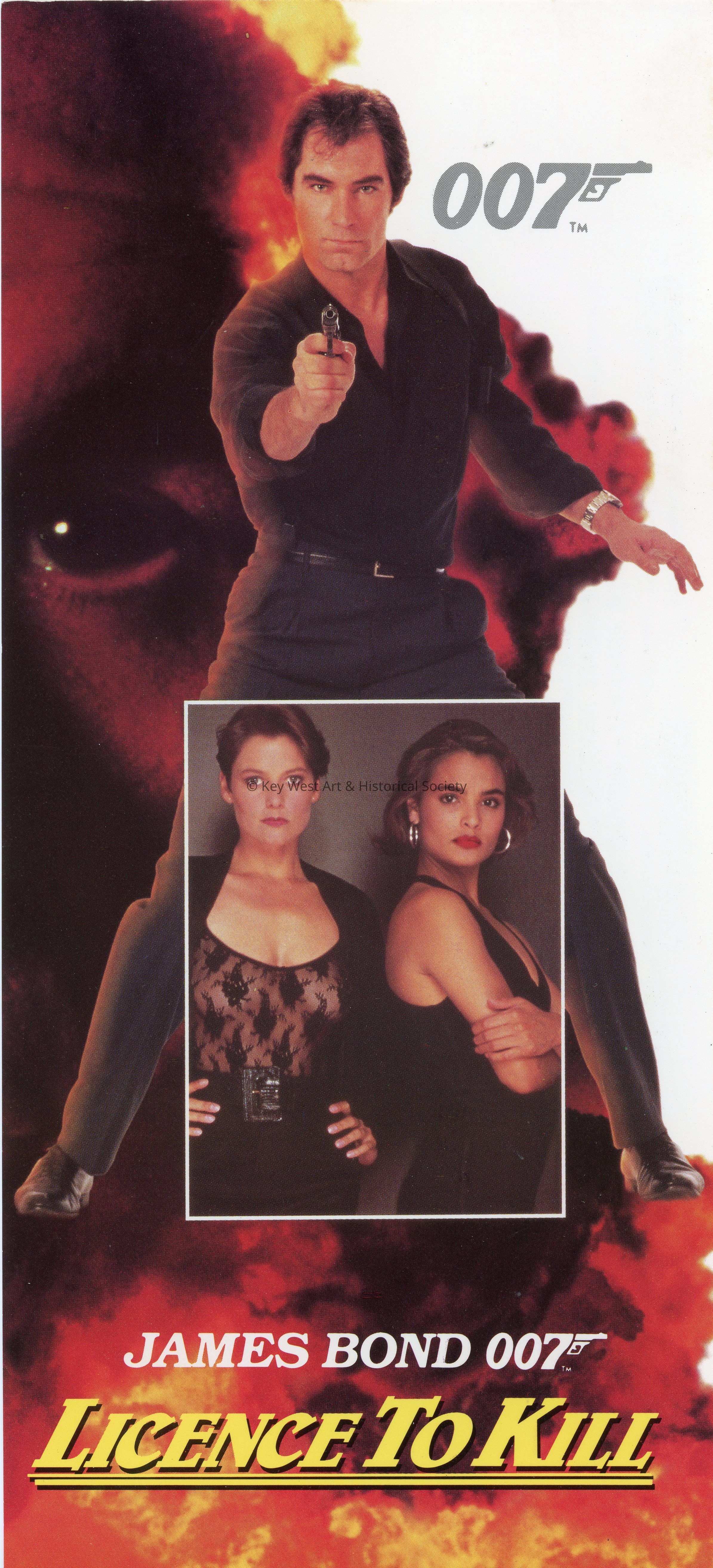 A flyer advertising a special Key West showing of the film 'Licence to Kill,' part of the James Bond film series. The flyer shows actor Timothy Dalton as James Bond along with Carey Lowell and Talisa Soto.