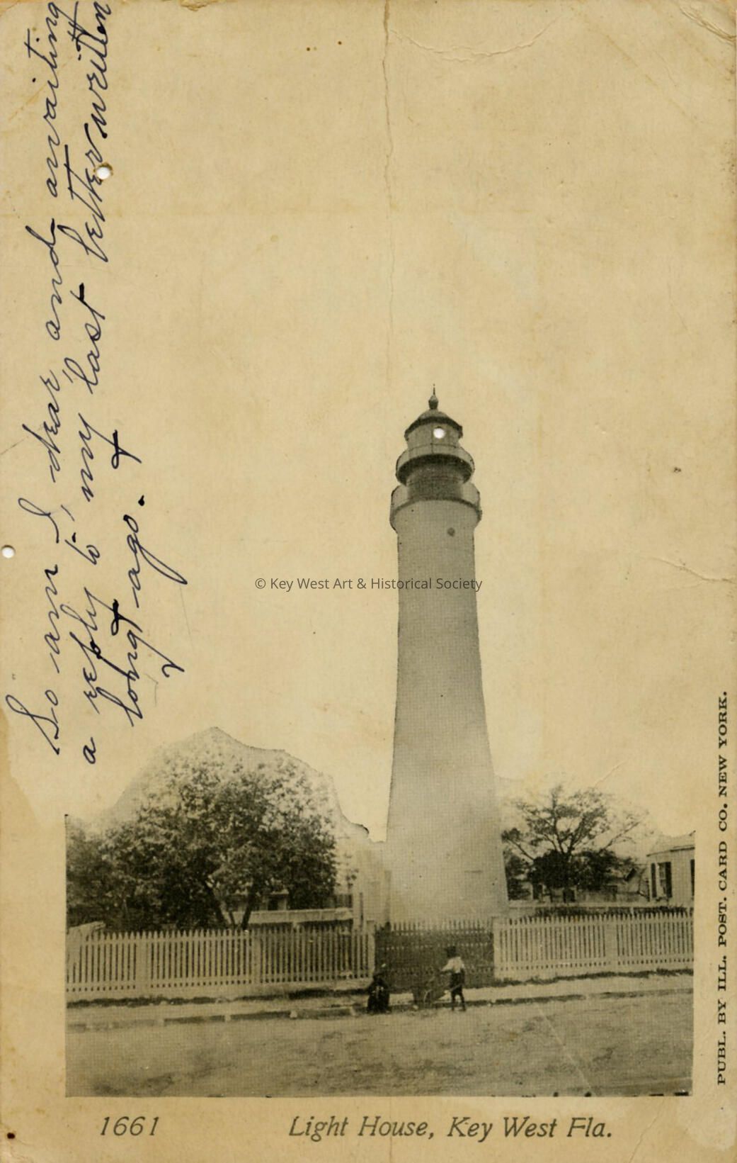 Postcard depicting two children standing outside the gate of the Key West Lighthouse. The caption reads, 'Light House, Key West Fla.'Subject Place