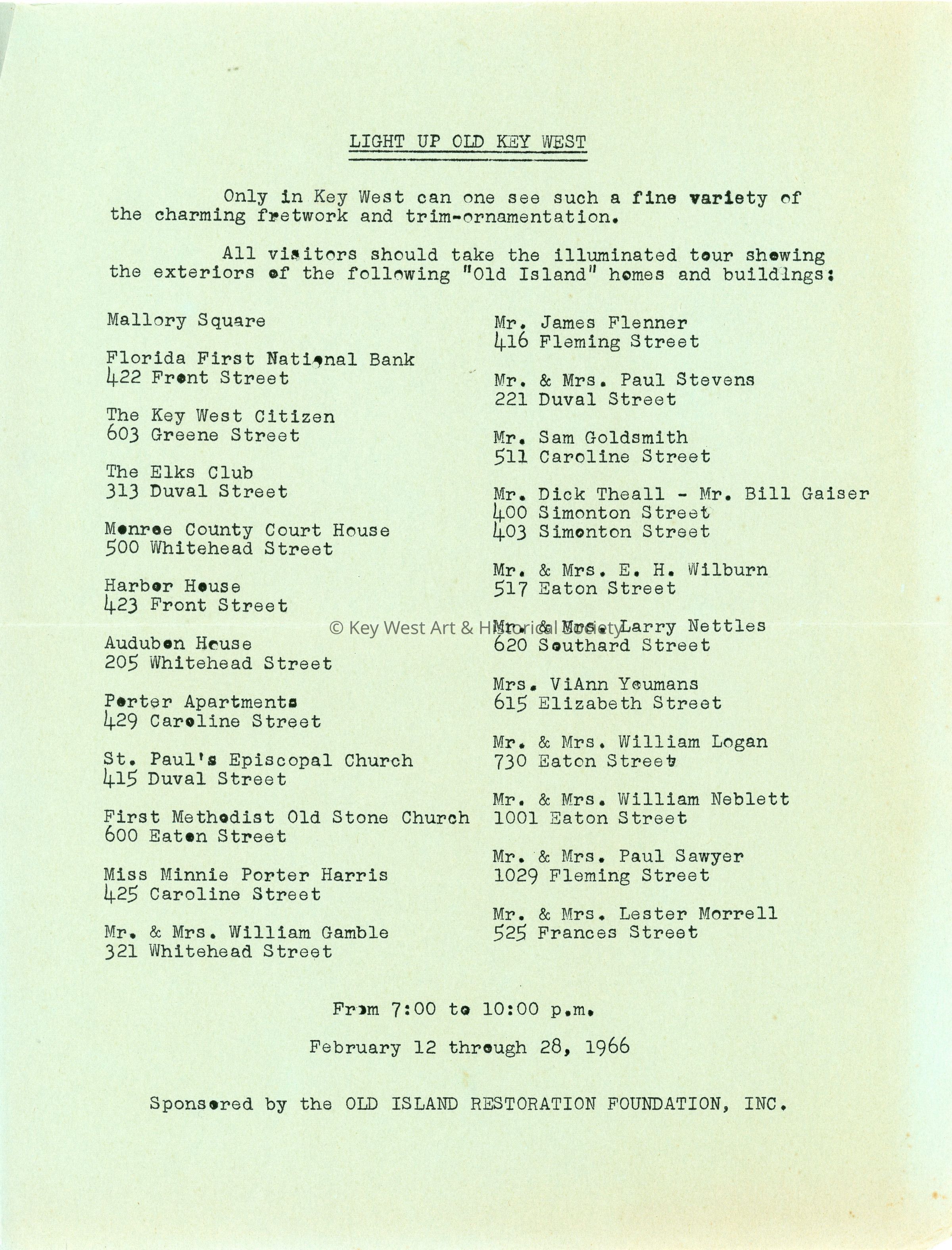 Paper flier for the Light Up Old Key West event sponsored by the Old Island Restoration Foundation. The illuminated tour took visitors to homes and businesses whose architecture had 'charming fretwork and trim-ornamentation.'Collection