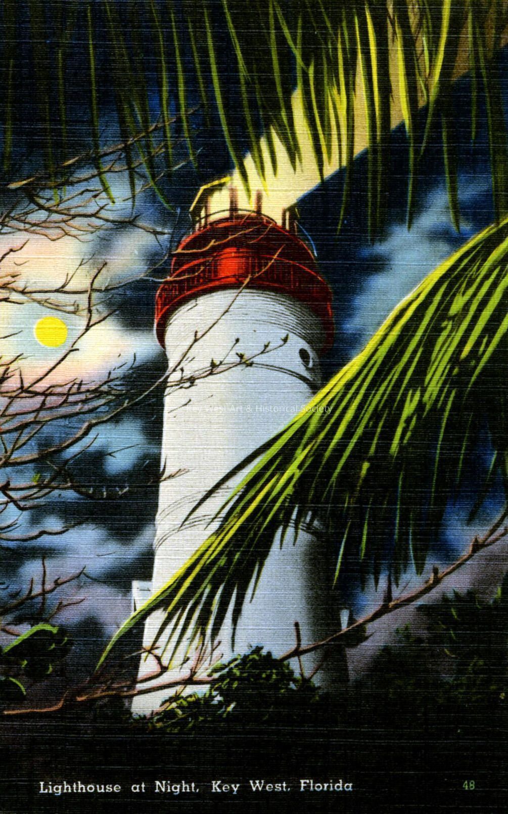 Postcard depicting the Key West Lighthouse at night. The caption reads, 'Lighthouse at Night, in Key West, Florida'. Notation on verso, ‘Key West is an island domain of quaint charm, with beautiful beaches, fine climate and excellent fishing waters. It is joined to the mainland of Florida by the New Overseas Highway. It also has the unique distinction of having the only lighthouse in the United States that is within city limits.’Collection