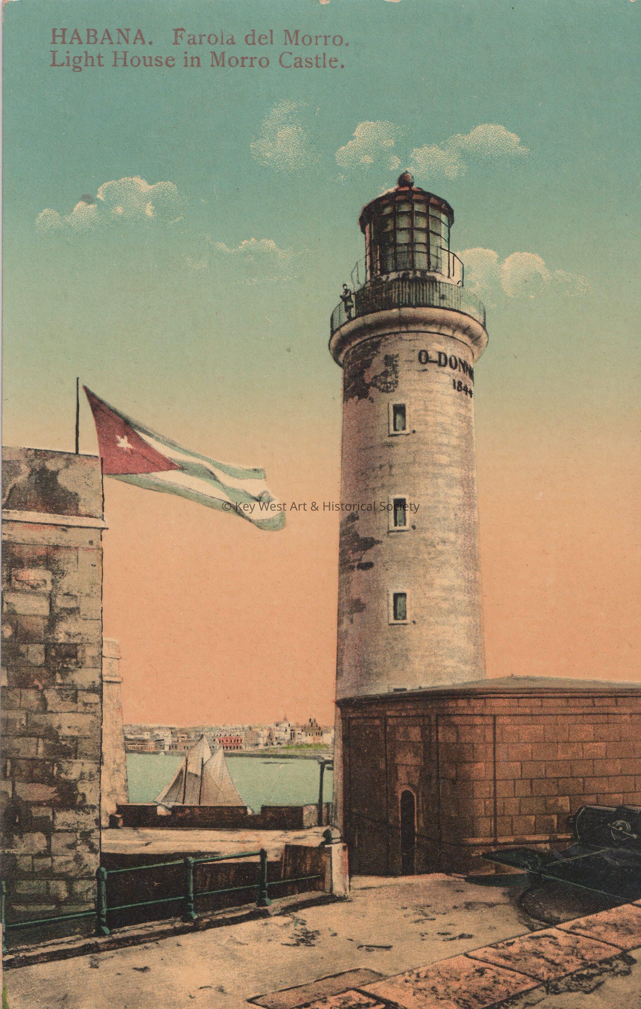 Postcard depicting a lighthouse and Cuban flag. The caption reads, ‘Havana. Farola del Morro. Lighthouse in Morro, Cuba.’ The description on the verso indicates the lighthouse was built around 1845.Subject Place