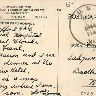 Postcard depicting a linoleum cut of the Florida Keys from the Dudley Studio of Arts & Crafts.Collection