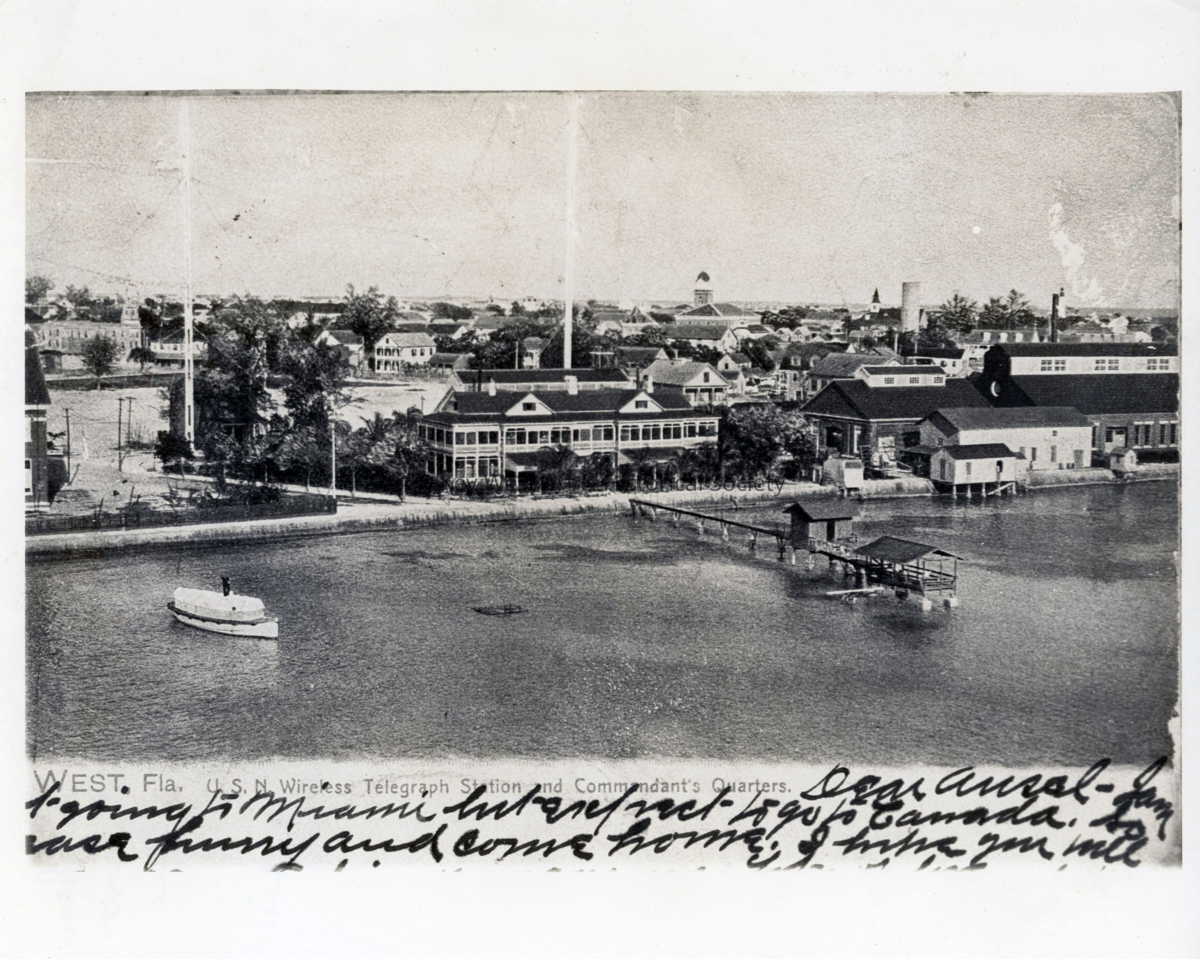 Black and white photograph of Naval Station Key West waterfront with the Little White House and the Foundry building visible along the shoreline.