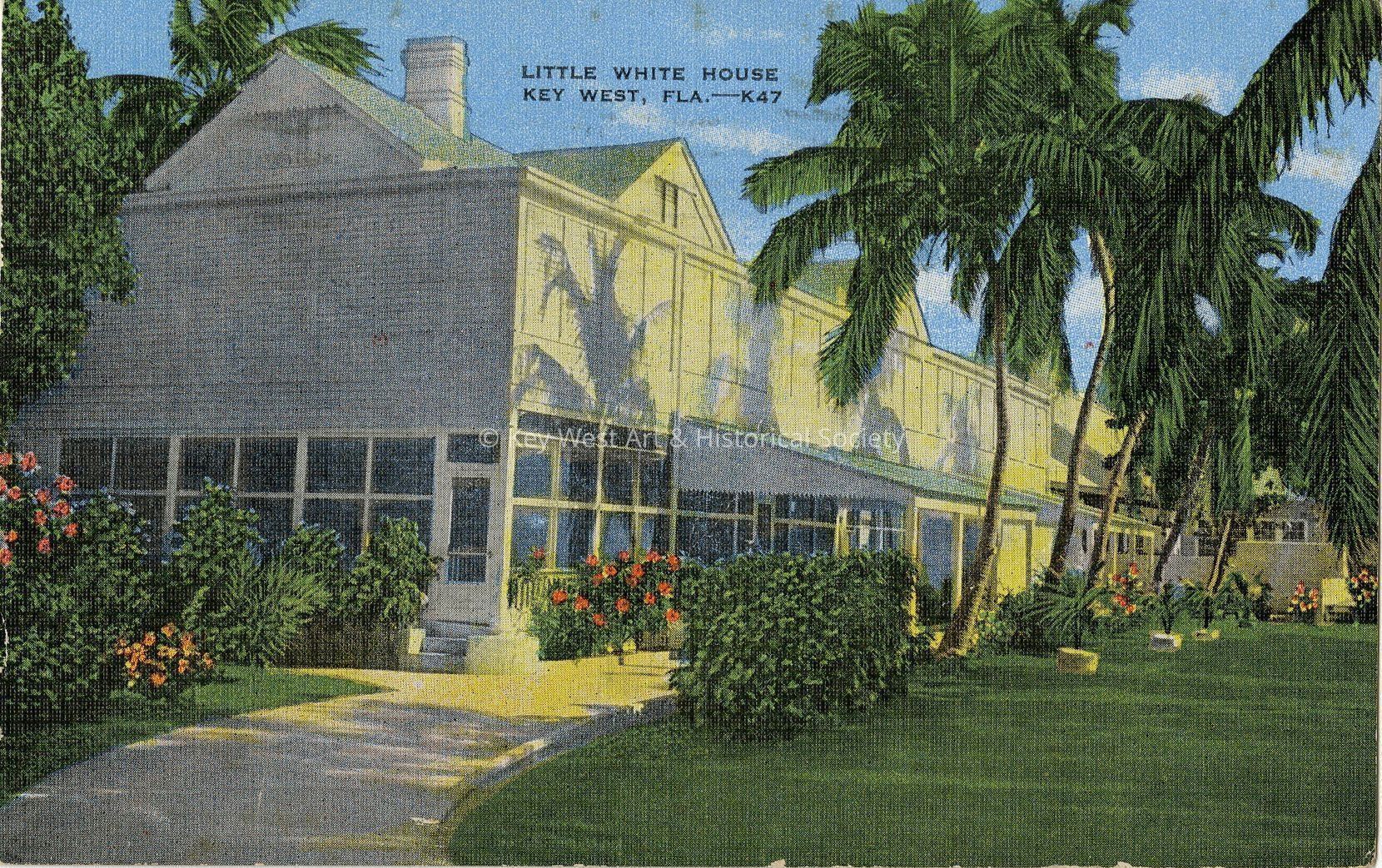 Postcard depicting the Little White House in Key West, Florida. "The President's favorite winter resort, a delightful spot for recuperation in a luxuriant tropical setting, profuse with beautiful flowers and the best fishing grounds near by."Collection