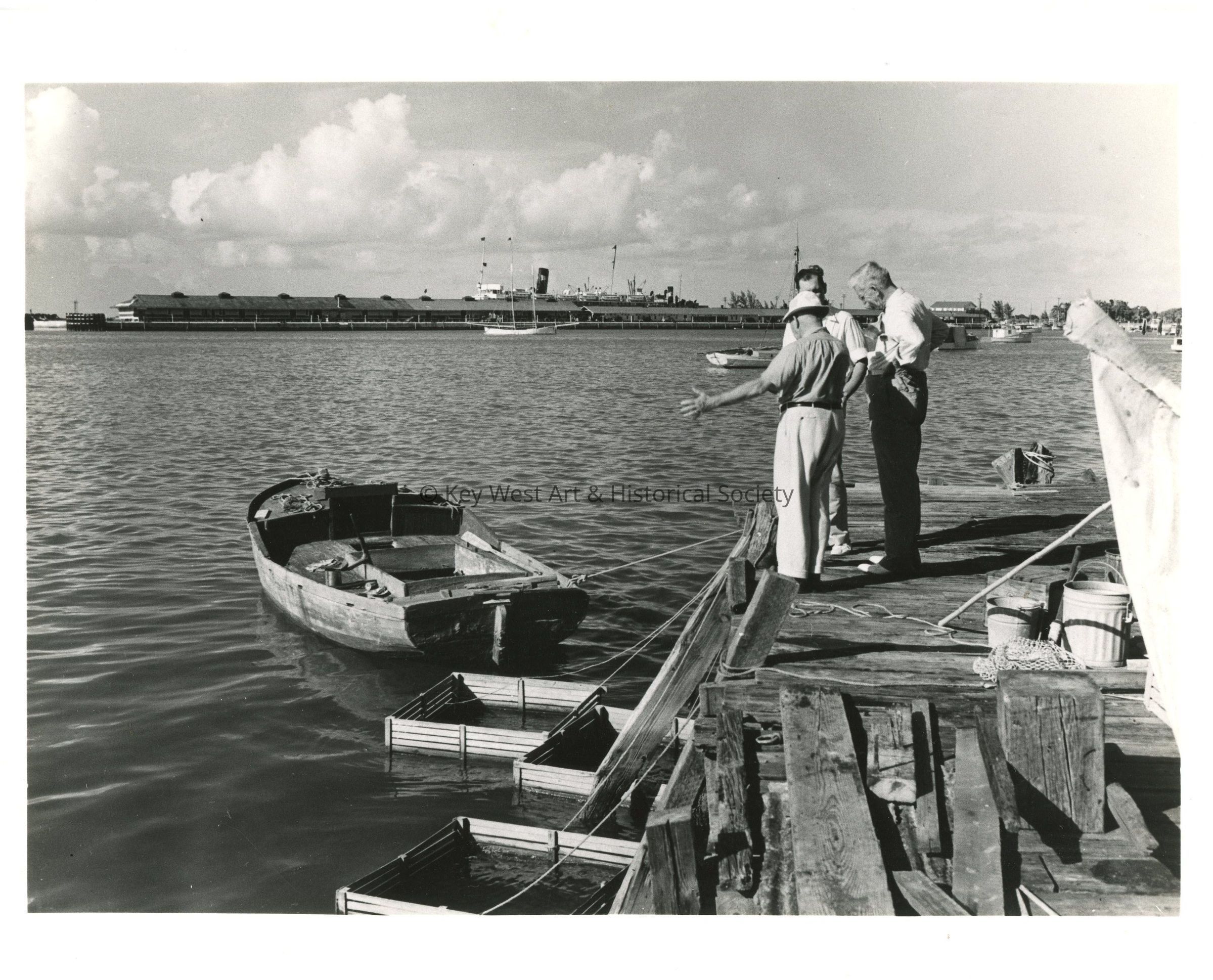 Black and white photograph of men standing at the dock over live bait crates at the Key West Bight.