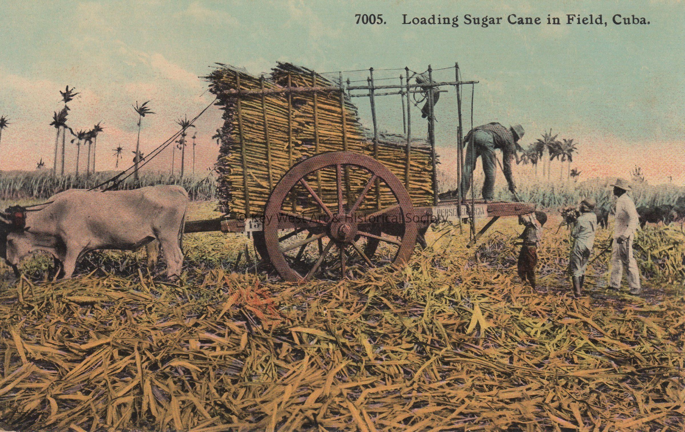Postcard depicting men and boys loading an ox-drawn cart with sugar cane. The caption reads, ‘Loading Sugar Cane in Field, Cuba.’Subject Place