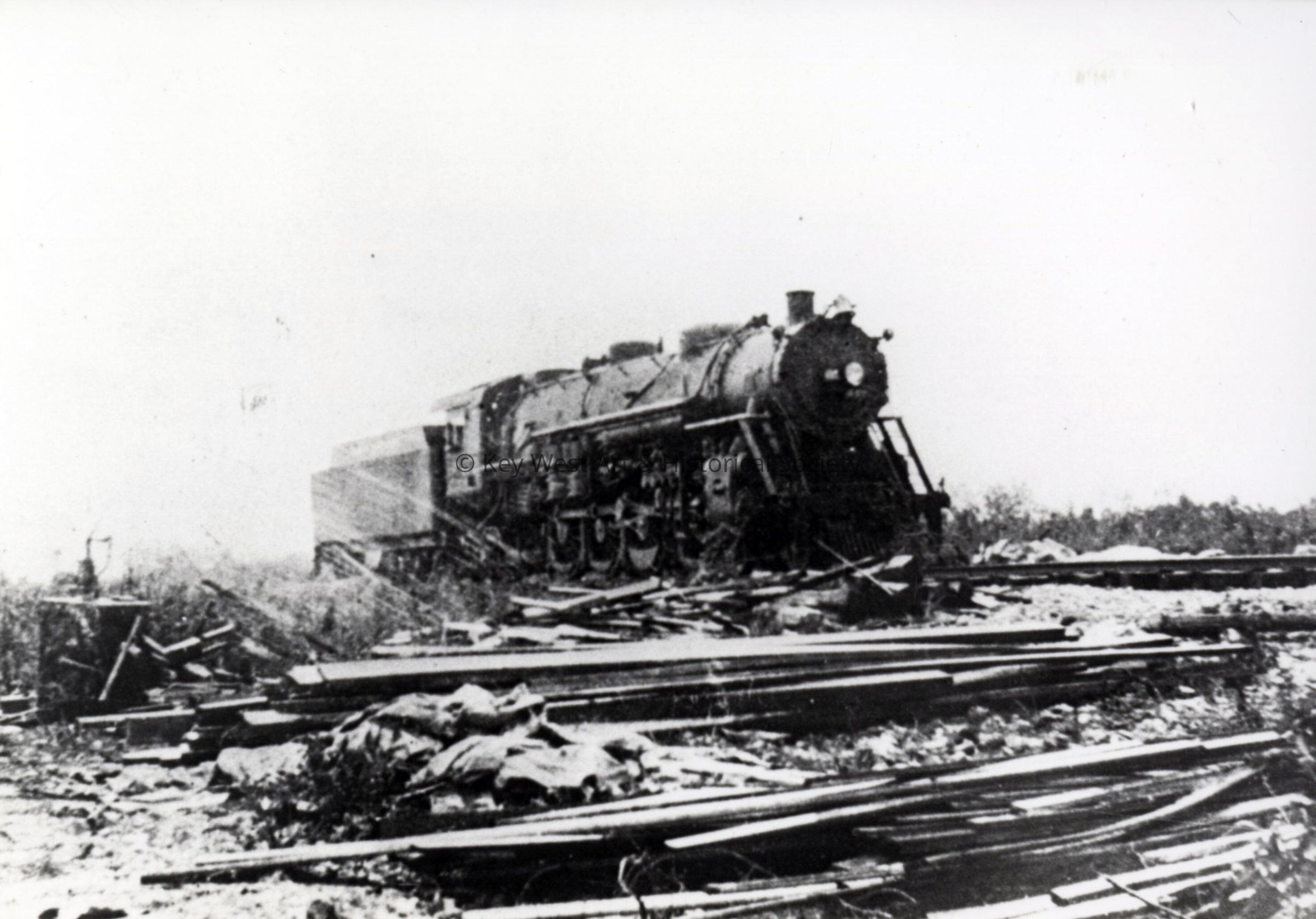 Black and white photograph of a Florida East Coast Railway locomotive on the tracks following the Labor Day Hurricane. Caption on verso, 'Upper Matecumbe Key after the hurricane that struck on Labor Day, 1935. This view shows the locomotive of the train sent to rescue the veterans. Number 447 was a 4-8-2 type with cylinders measuring 26" by 28" and drivers over 6' in diameter. It was built in 1926 and weighed more than 160 tons, which is the reason it withstood the storm surge and remained on the tracks.'Photograph Details